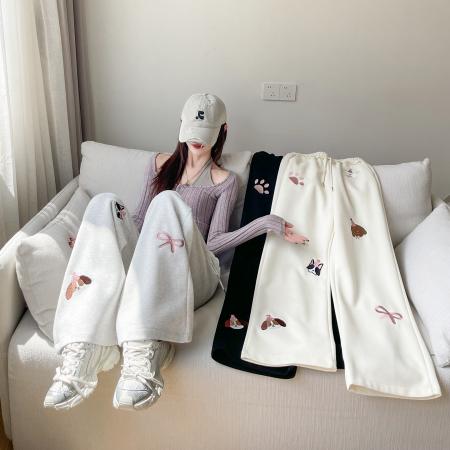 FA43598# 趣味小狗贴布绣花阔腿裤女秋冬新款显瘦直筒卫裤休闲运动裤 服裝批發女裝批發服飾貨源