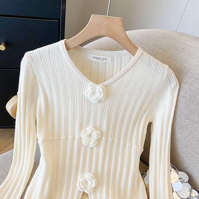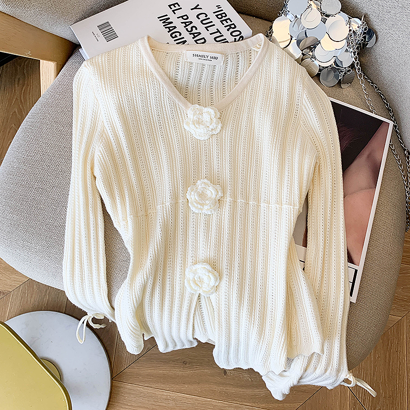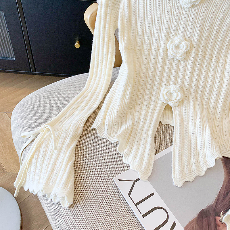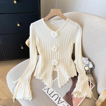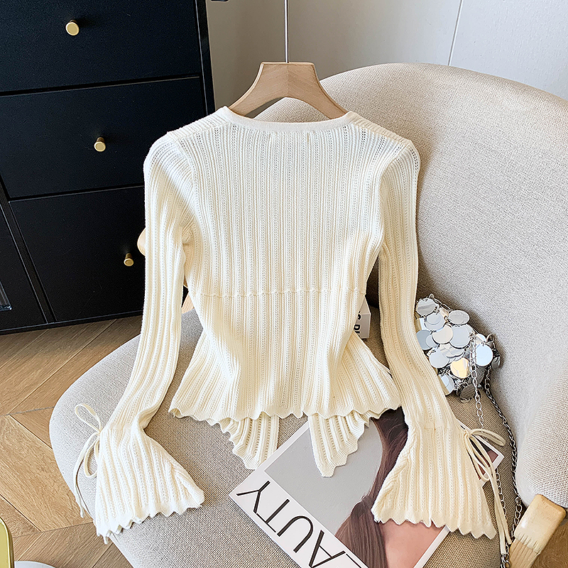 FA43092# 法式v领镂空针织衫女秋季新款别致喇叭袖开衫纯欲掐腰小上衣 服裝批發女裝批發服飾貨源