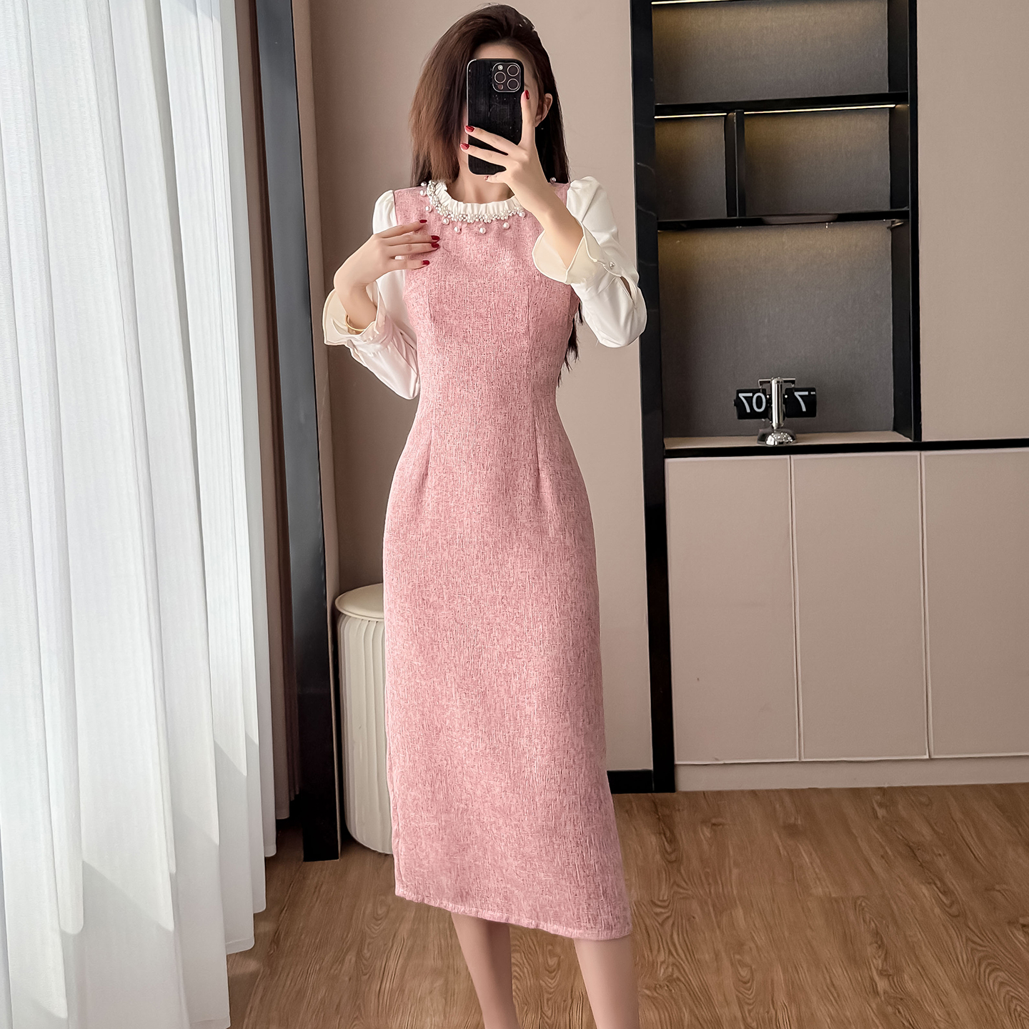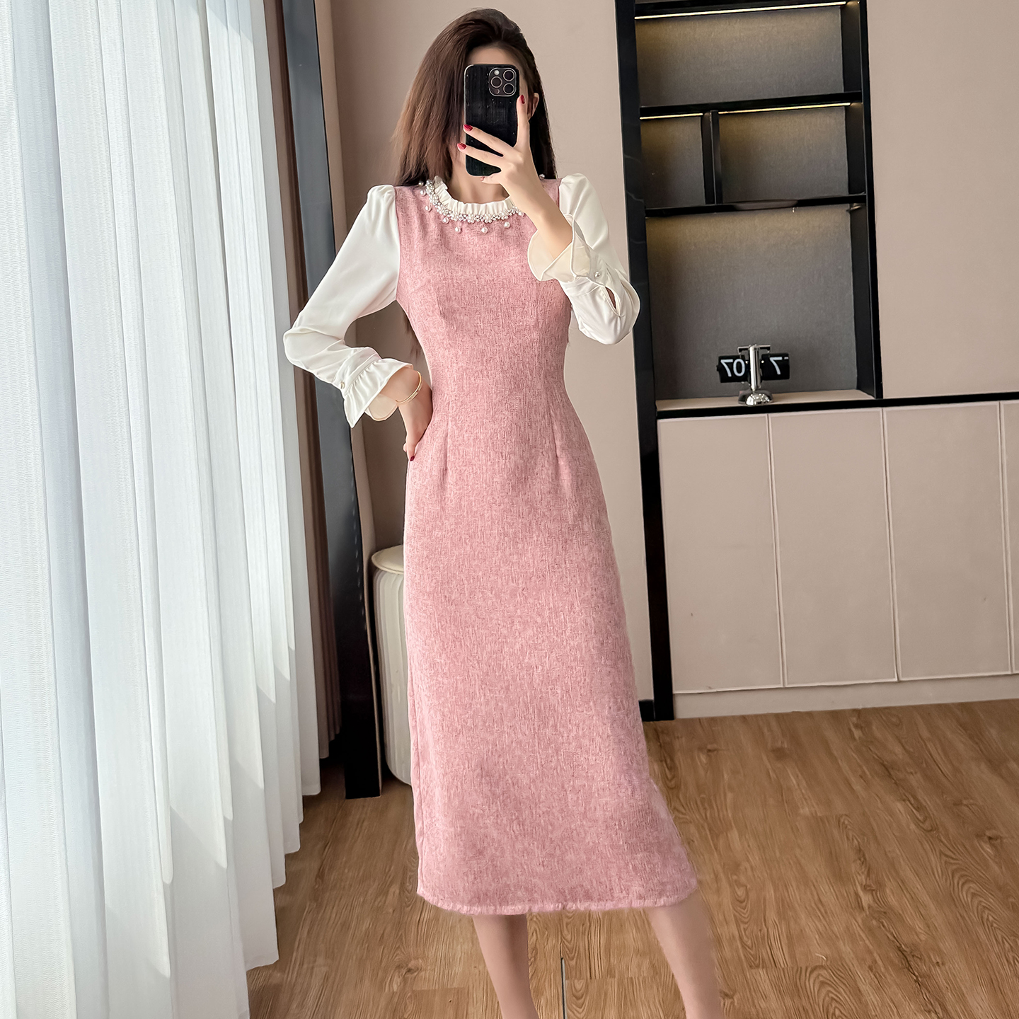 FA43093# 秋冬小香风钉珠配大衣打底连衣裙子富家千金拼接粉色裙子 服裝批發女裝批發服飾貨源