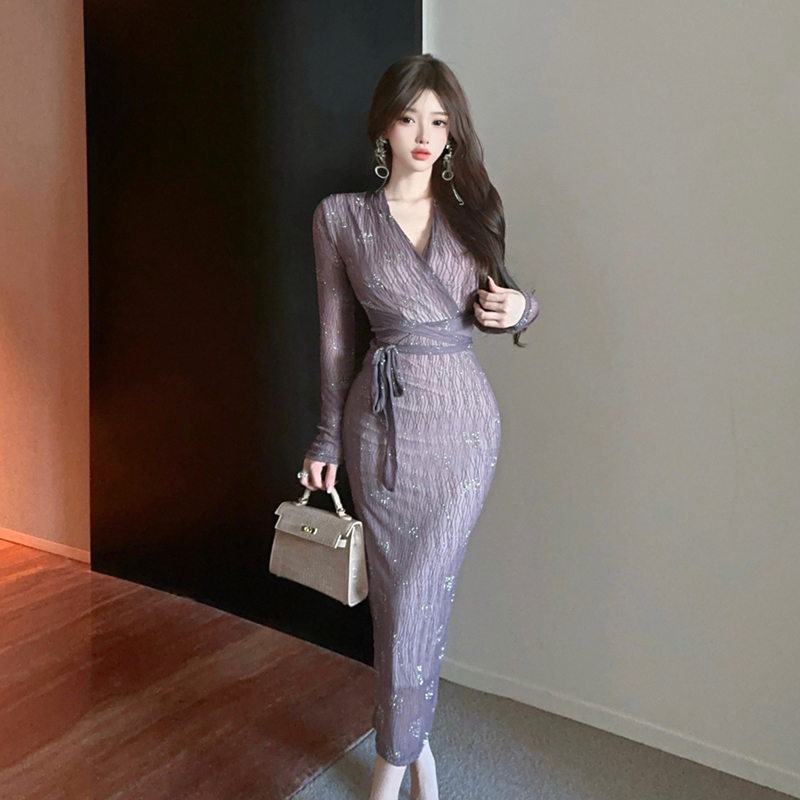 FA43305# 气质修身连衣裙法式复古纯欲风收腰显瘦烫钻包臀长裙 服裝批發女裝批發服飾貨源