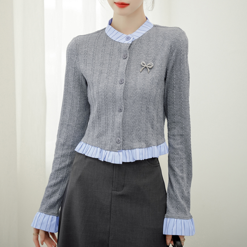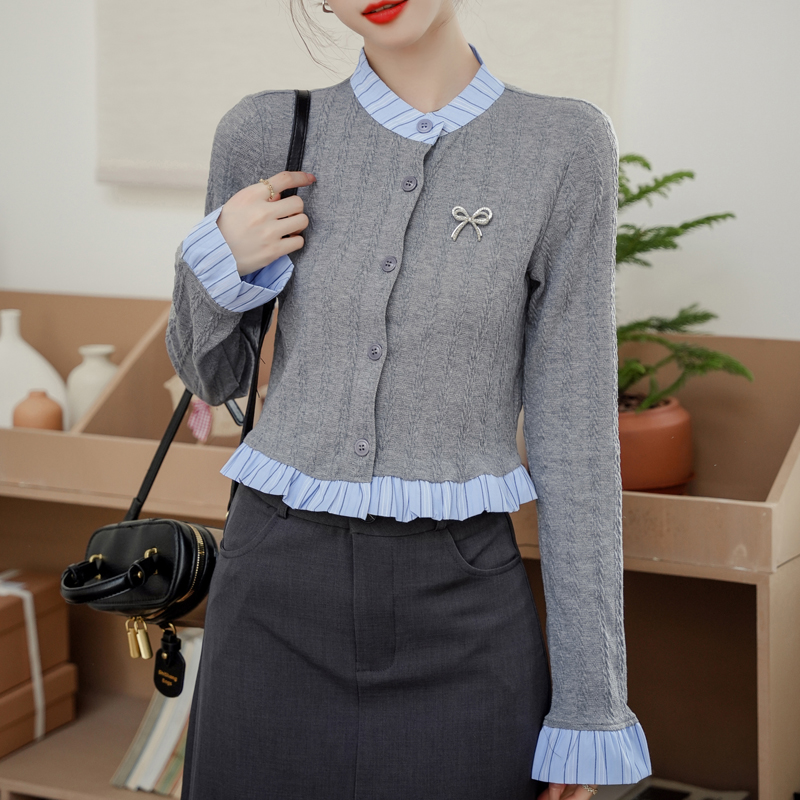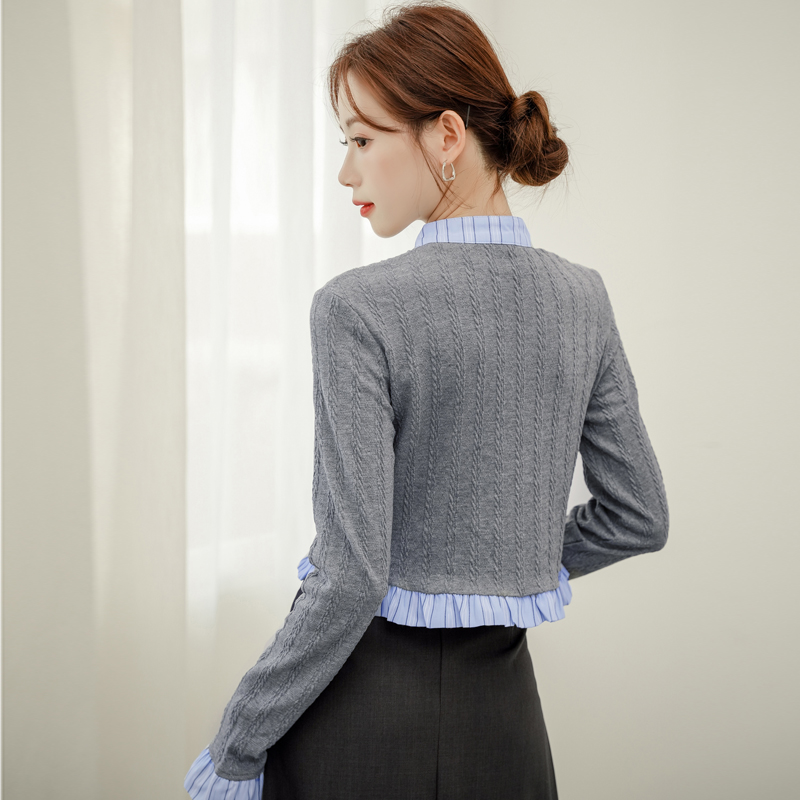 FA43334# 法式拼接条纹假两件针织衫设计感立领小众开衫上衣女 服裝批發女裝批發服飾貨源