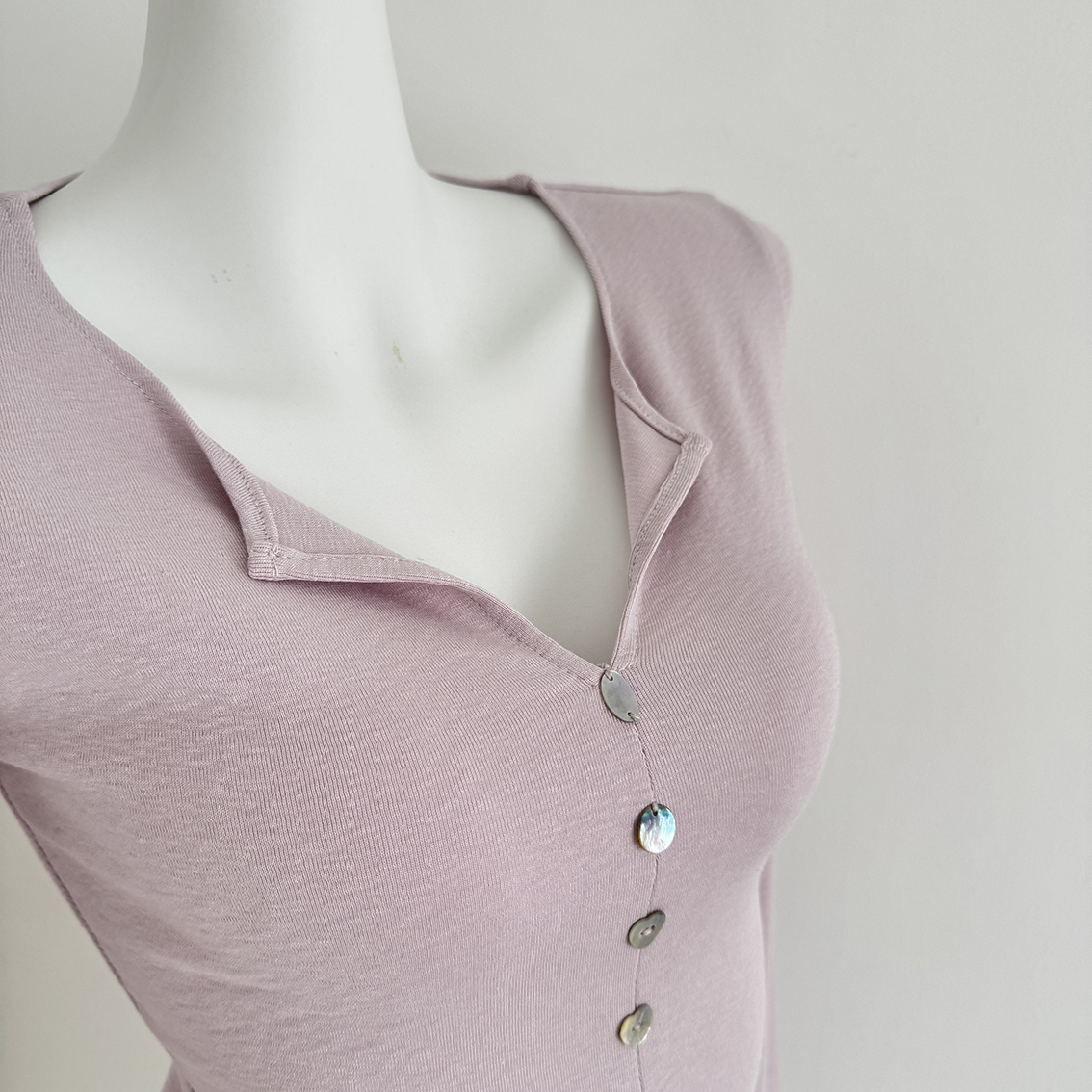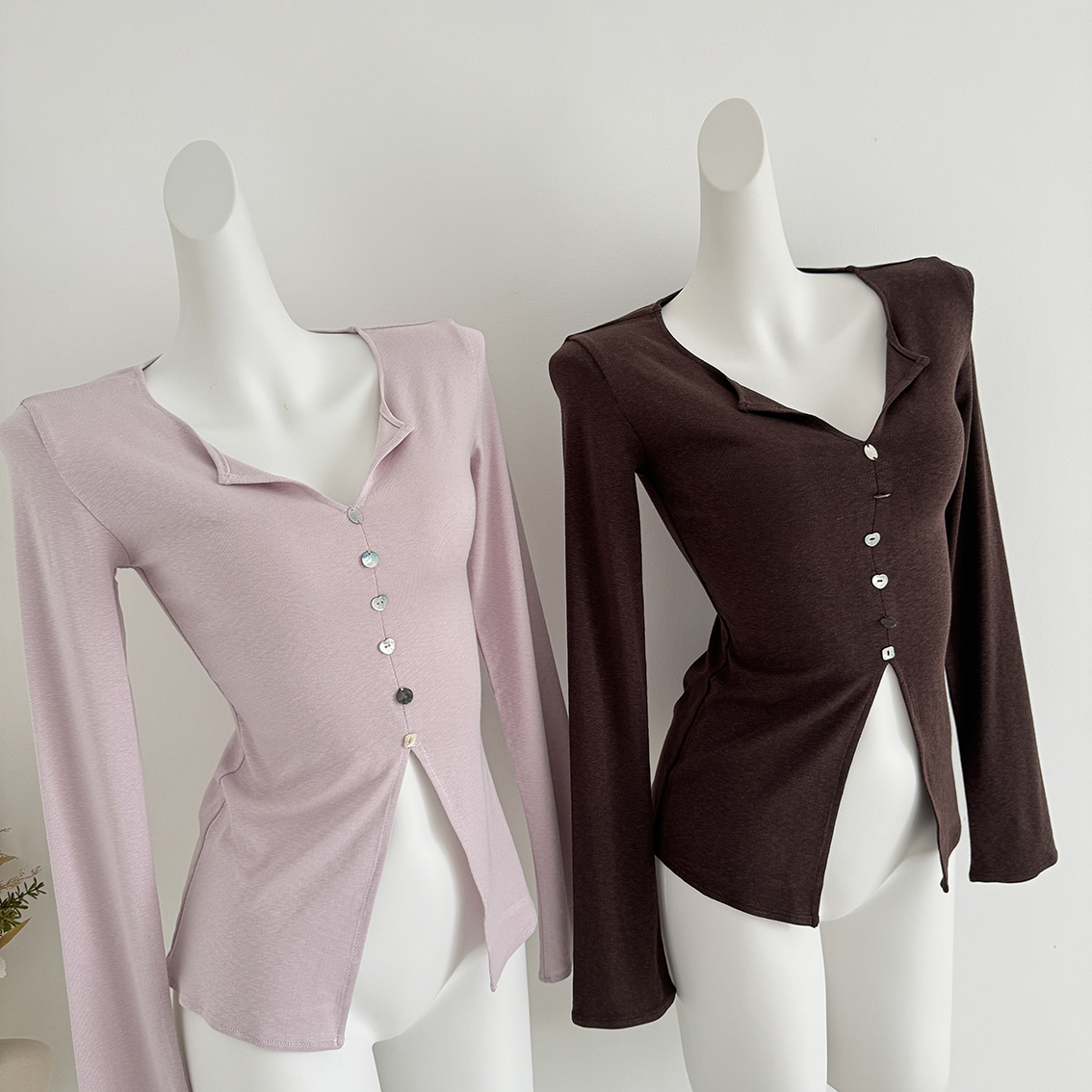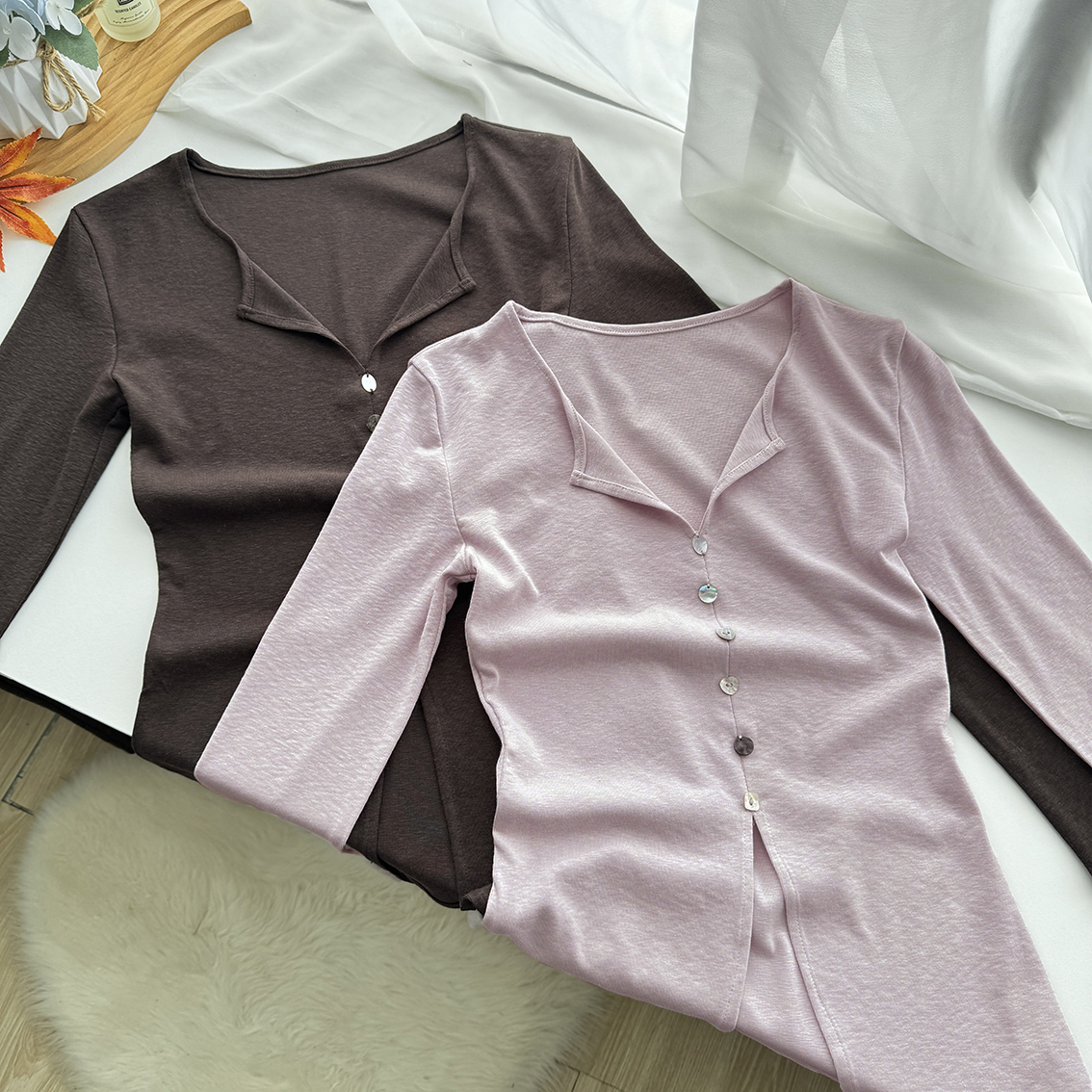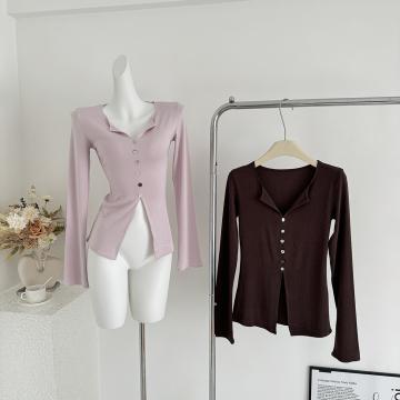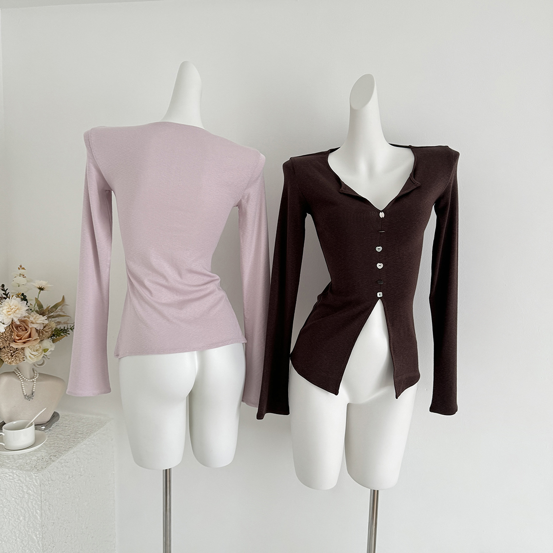 FA43455# 设计感v领喇叭长袖收腰针织T恤衫修身显瘦上衣女 服裝批發女裝批發服飾貨源
