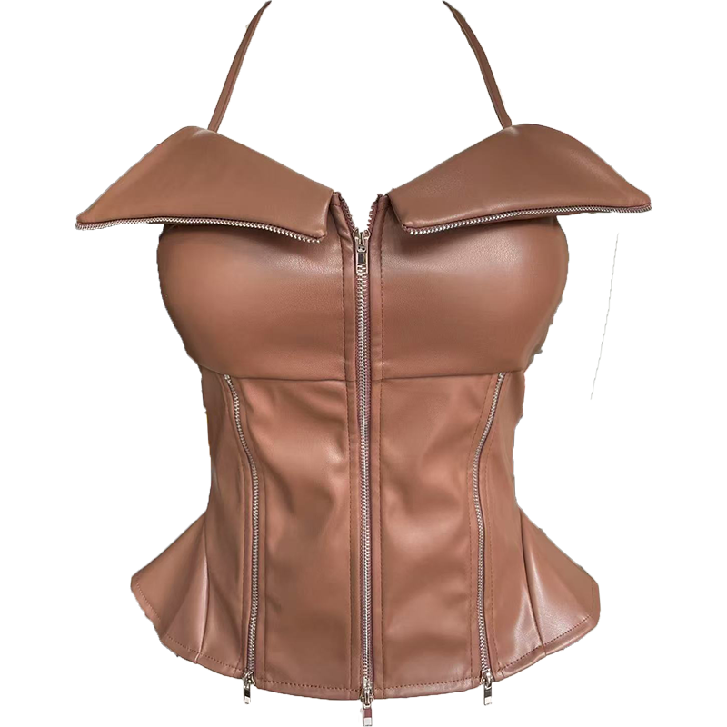 FA43487# 辣妹性感拉链PU皮挂脖吊带背心女设计感小众露背短款上衣 服裝批發女裝批發服飾貨源