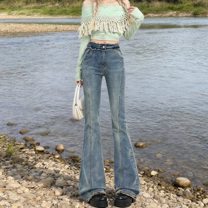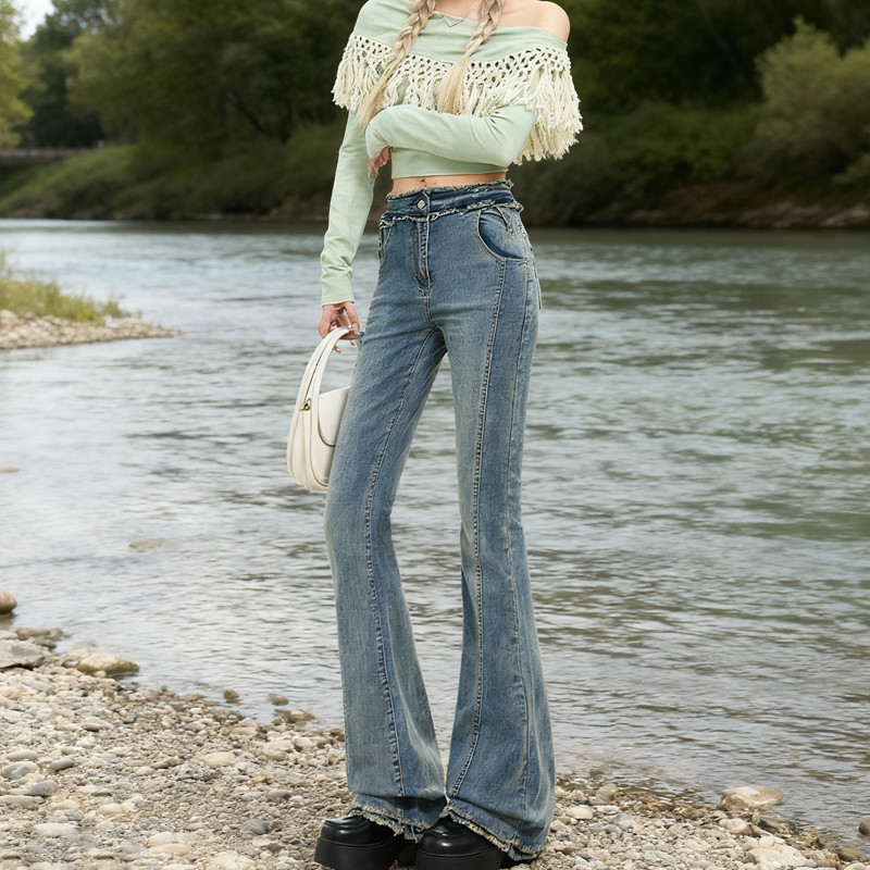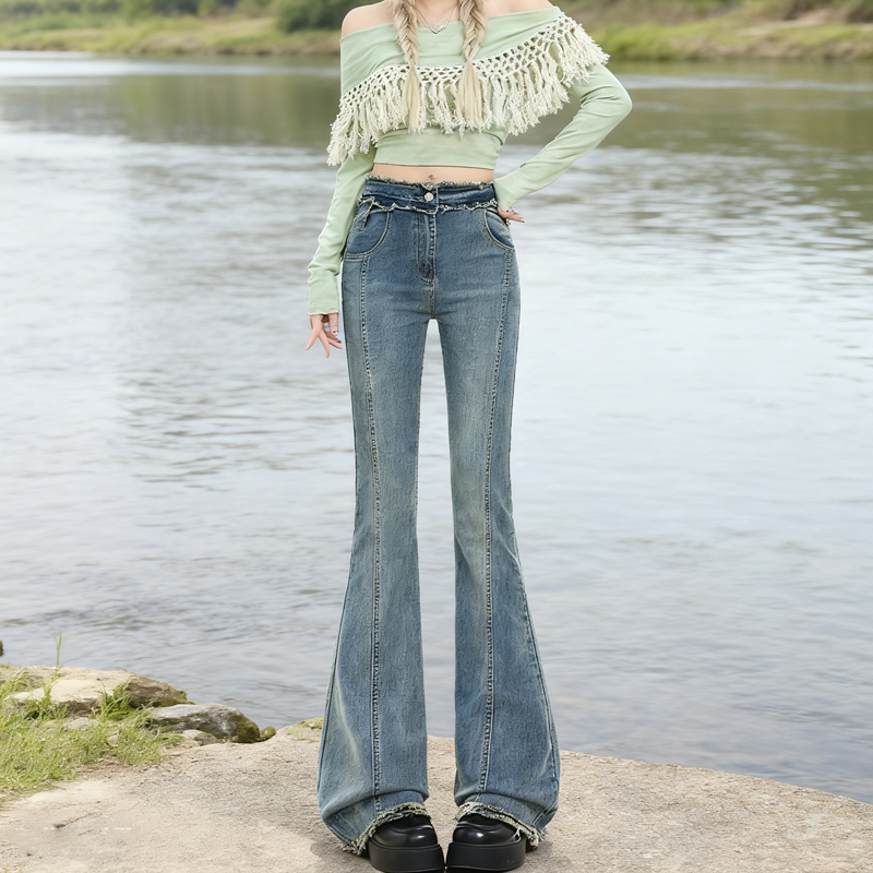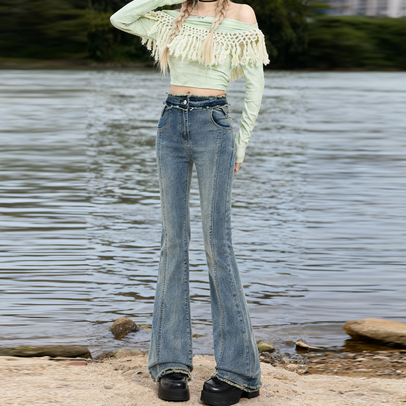 FA45277# 热卖视觉系列古早玫瑰毛边工艺修饰曲线微喇叭牛仔裤女 服裝批發女裝批發服飾貨源