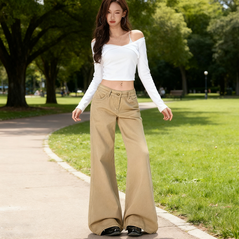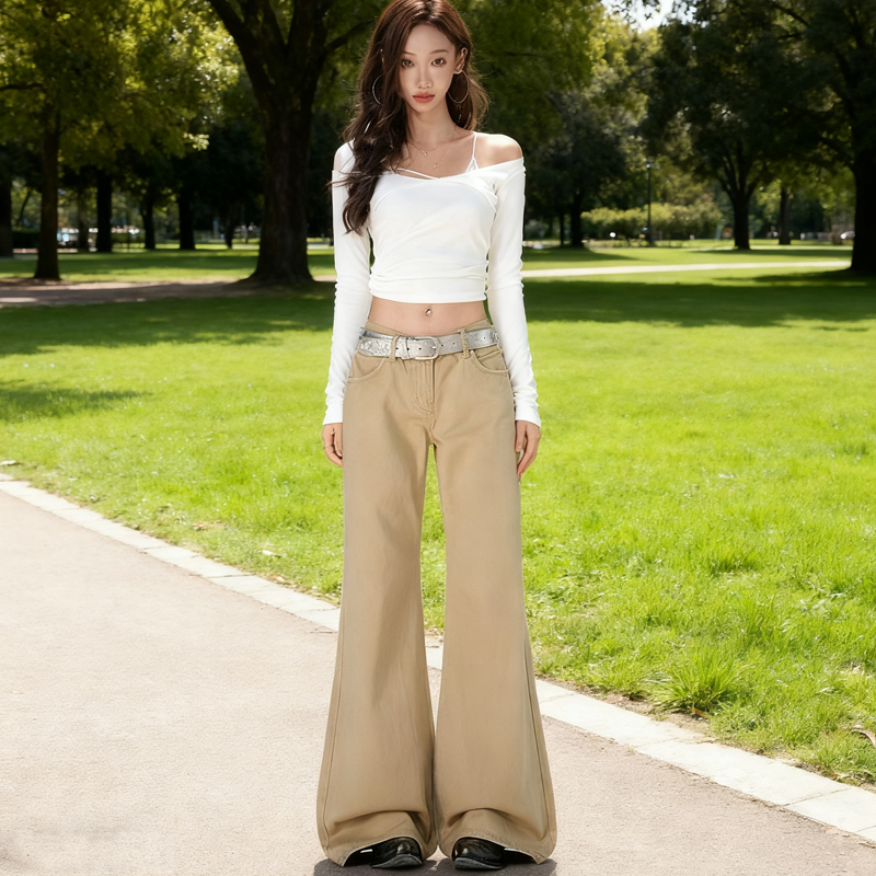 FA45279# 新款美式卡其色牛仔裤女低腰辣妹复古拖地不贴腿微喇裤子 服裝批發女裝批發服飾貨源