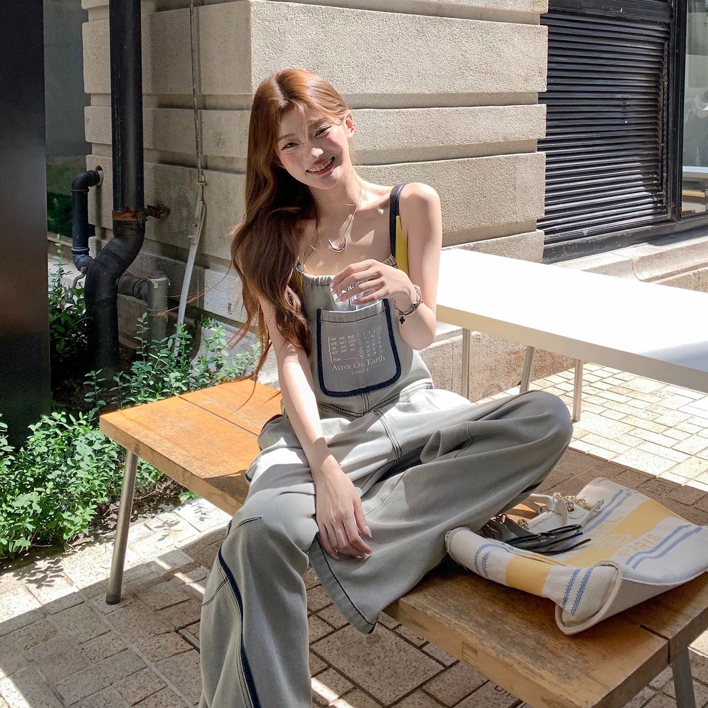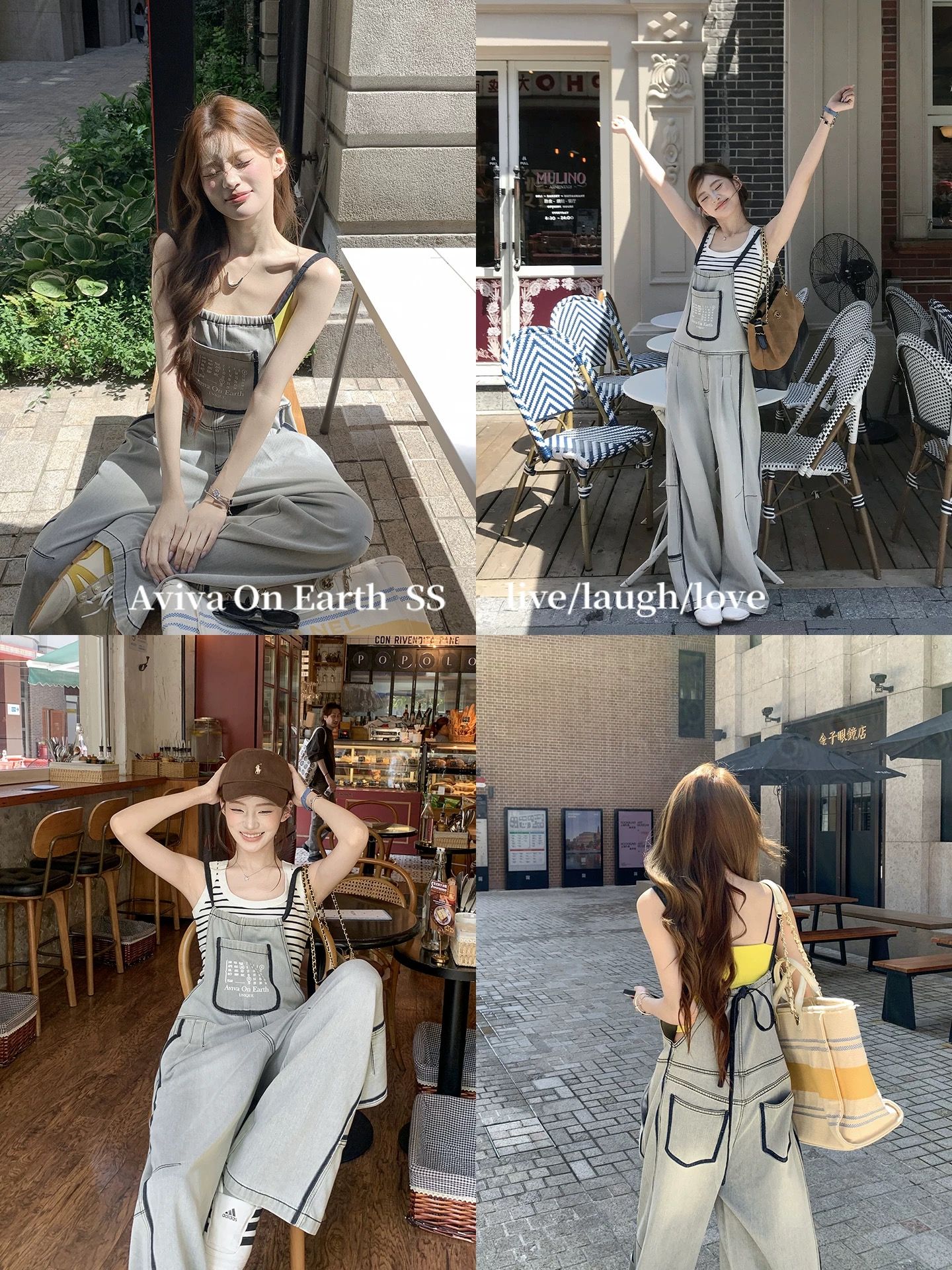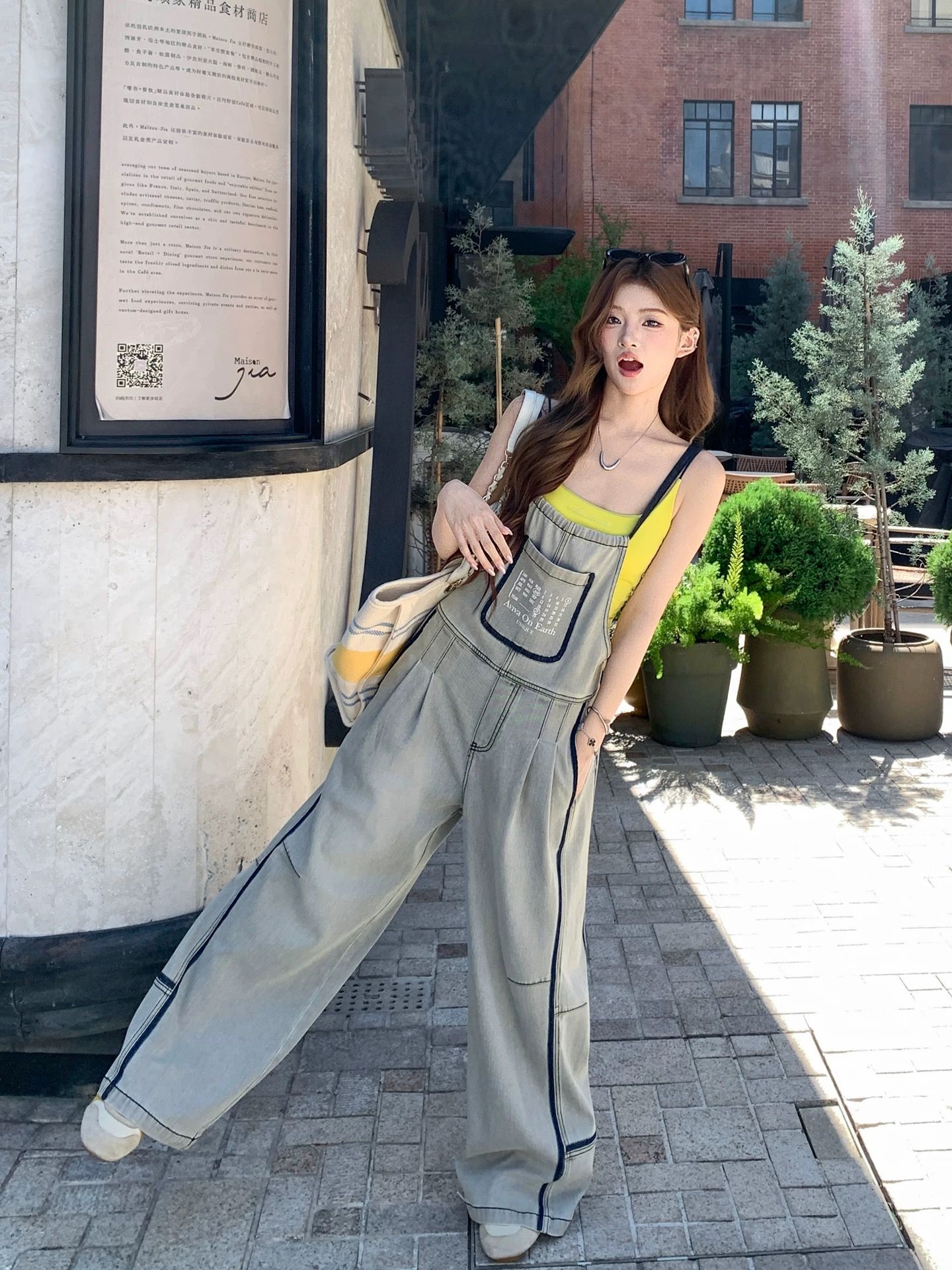FA45310# 地球店美式复古水洗牛仔背带裤女秋季设计感宽松休闲工装直筒裤 服裝批發女裝批發服飾貨源
