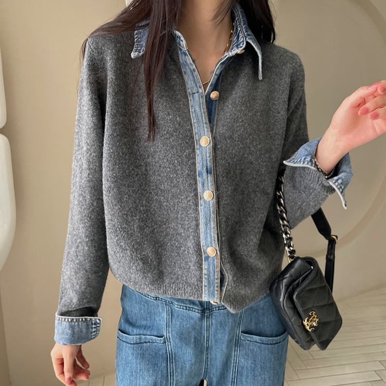 FA45312# 秋季韩系新款时尚牛仔拼接显瘦开衫外套高级感慵懒风针织开襟衫女 服裝批發女裝批發服飾貨源