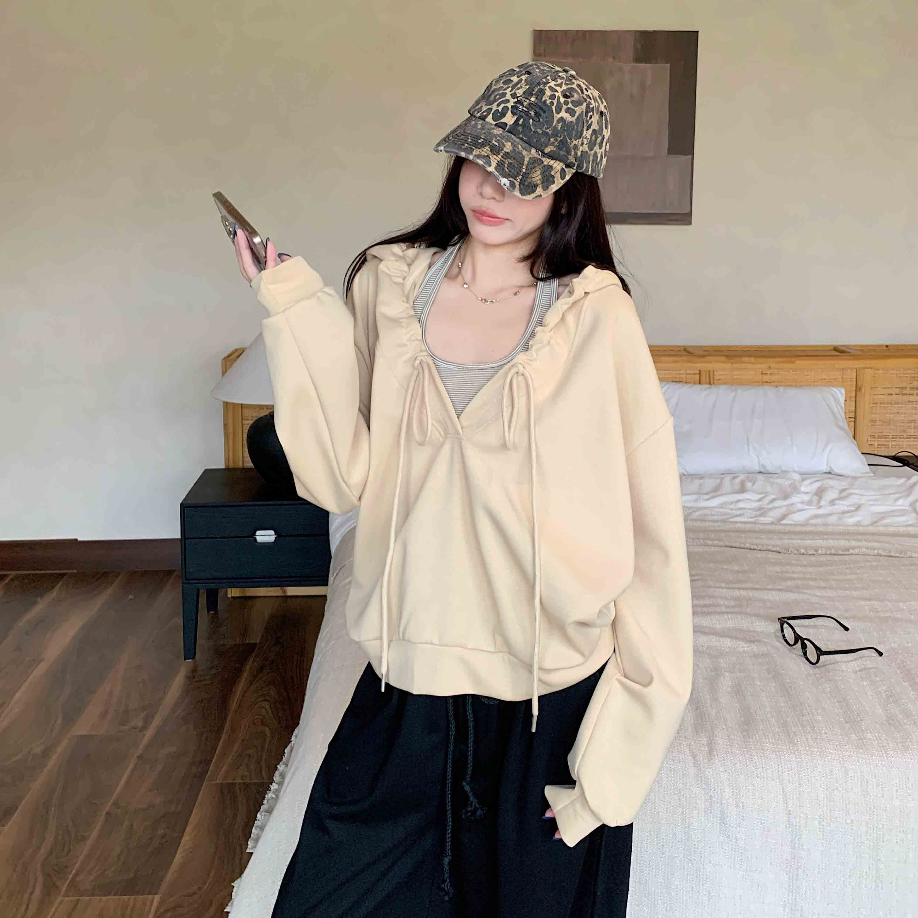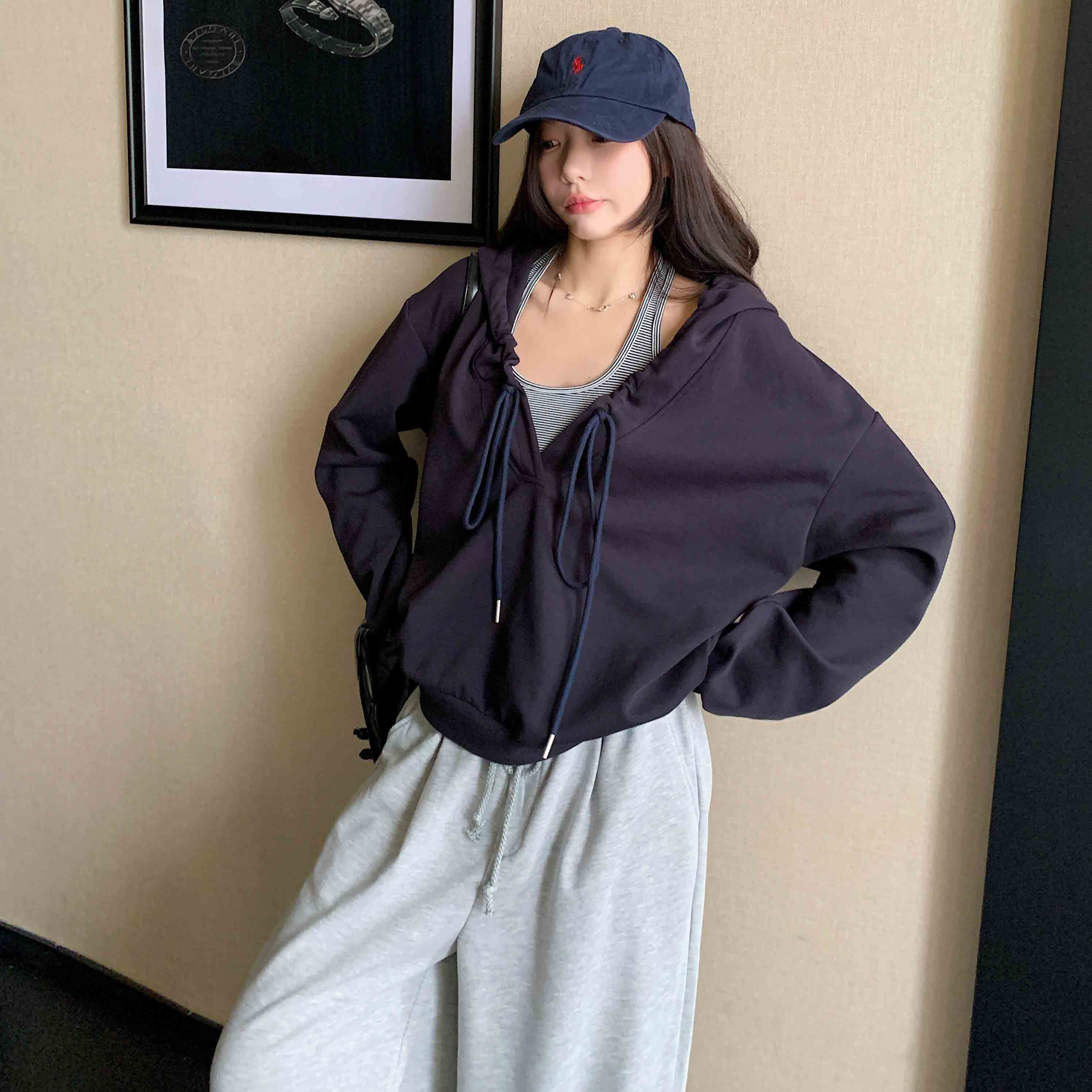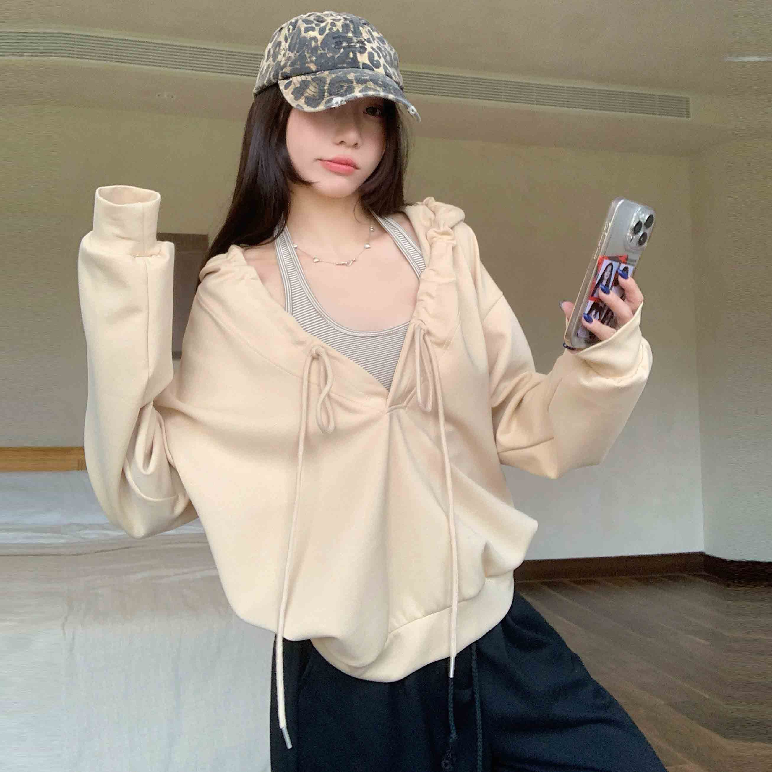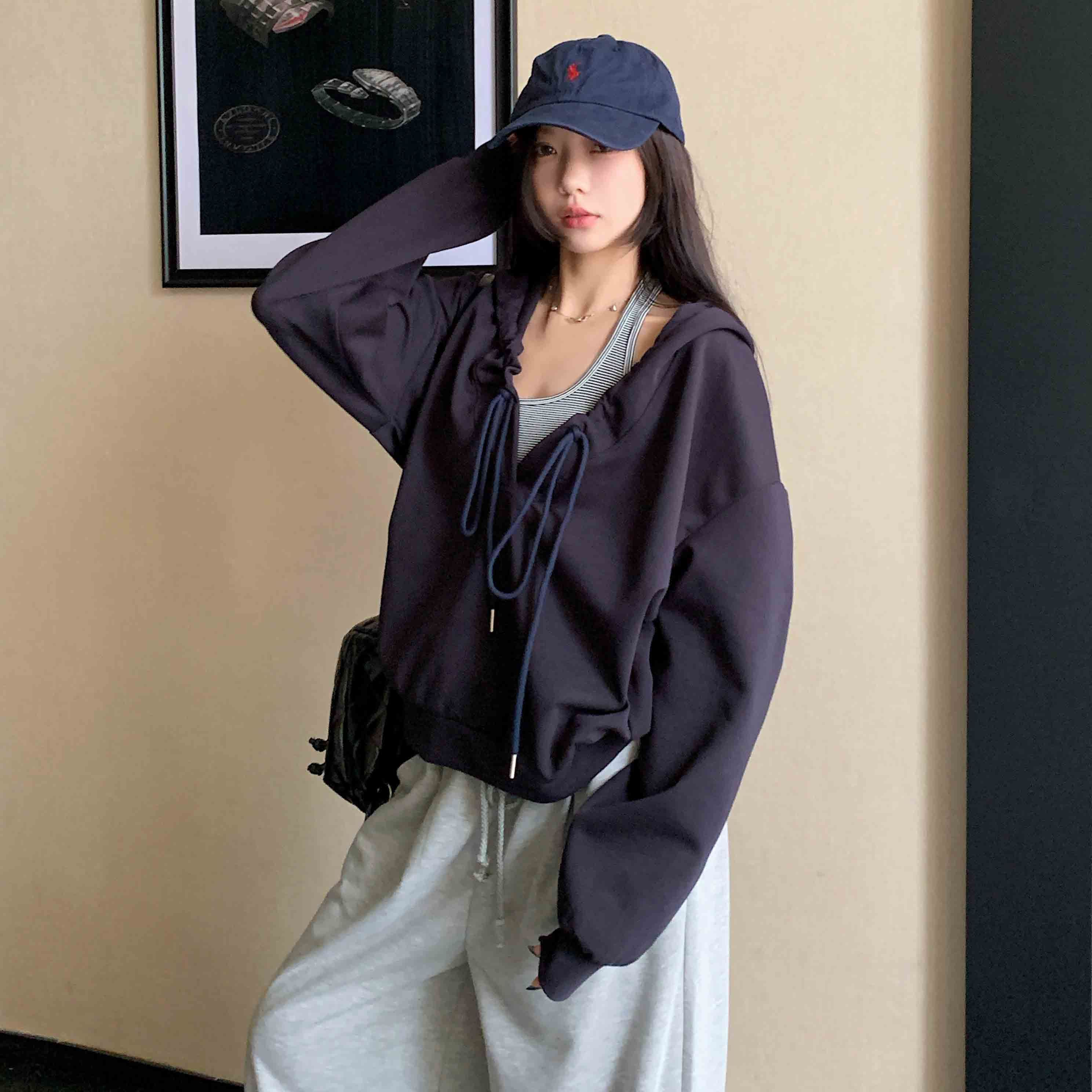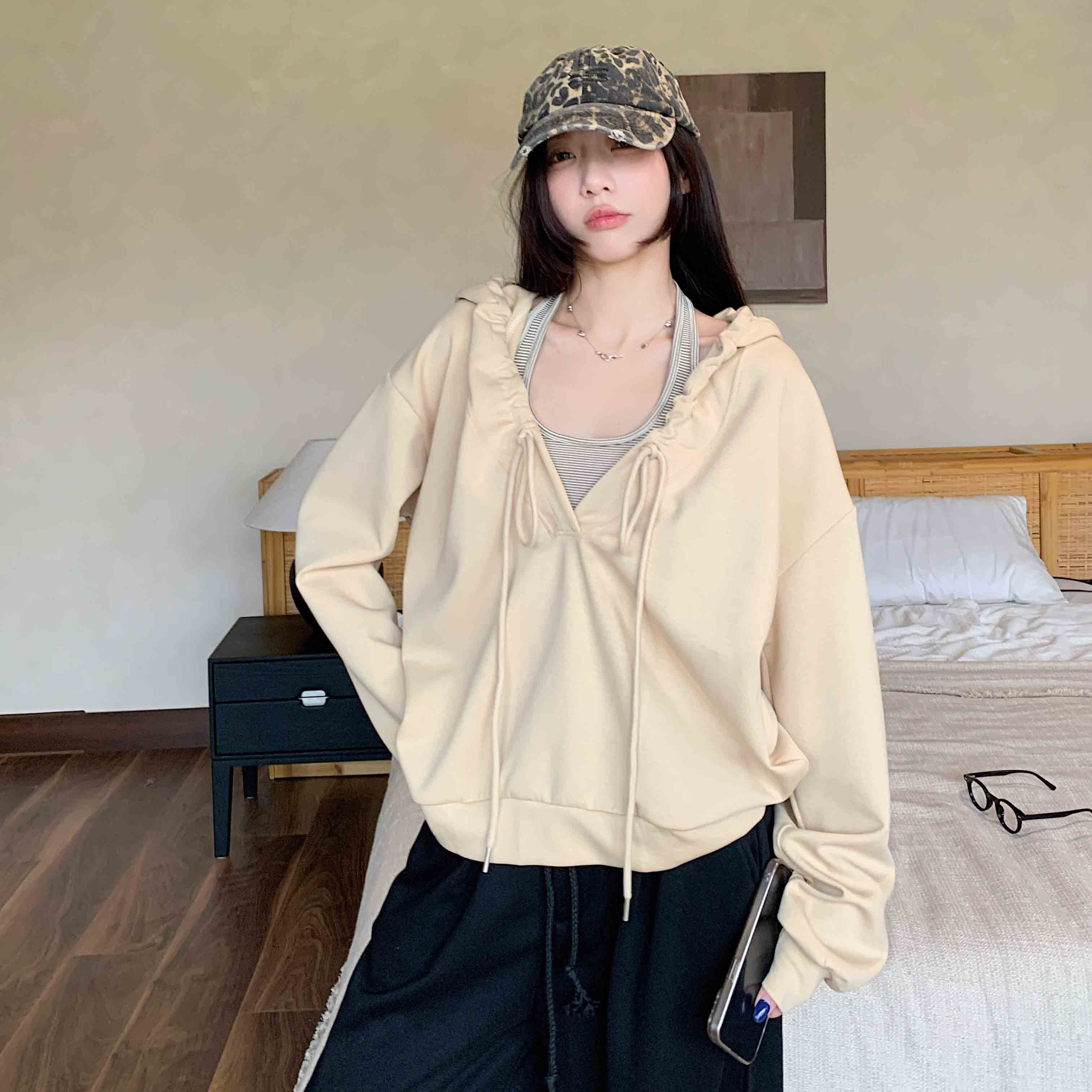 FA45597# 棉韩系抽褶连帽长袖卫衣女设计感慵懒风辣妹宽松上衣潮 服裝批發女裝批發服飾貨源
