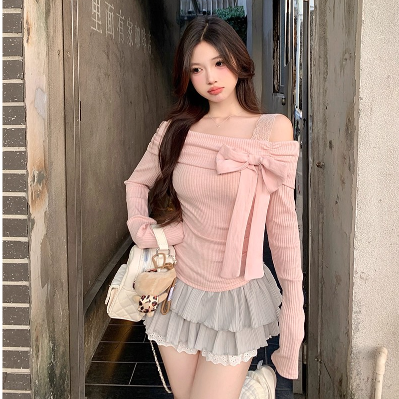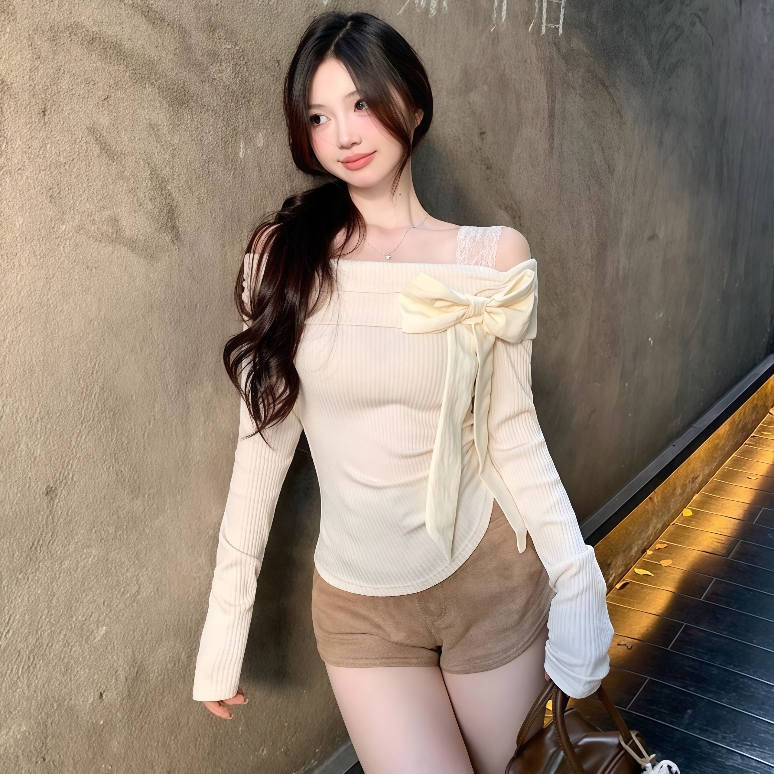 FA45756# 可拆蝴蝶结长袖女秋季修身甜美内搭设计感打底衫上衣 服裝批發女裝批發服飾貨源