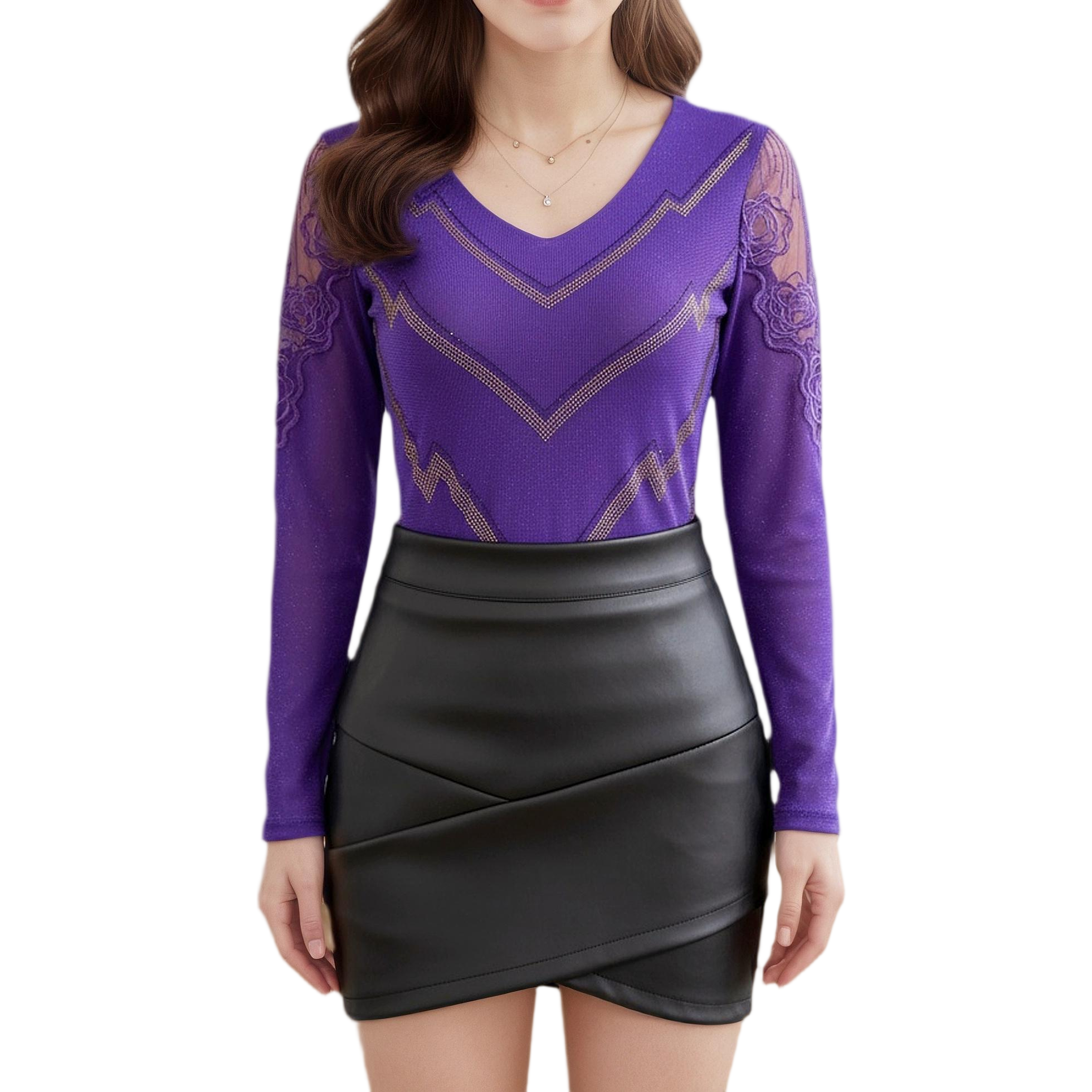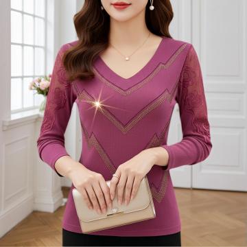 FA45818# 秋季新款女士长袖v领气质上衣洋气烫钻蕾丝袖拼接修身型网纱t恤 服裝批發女裝批發服飾貨源