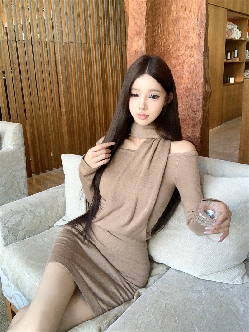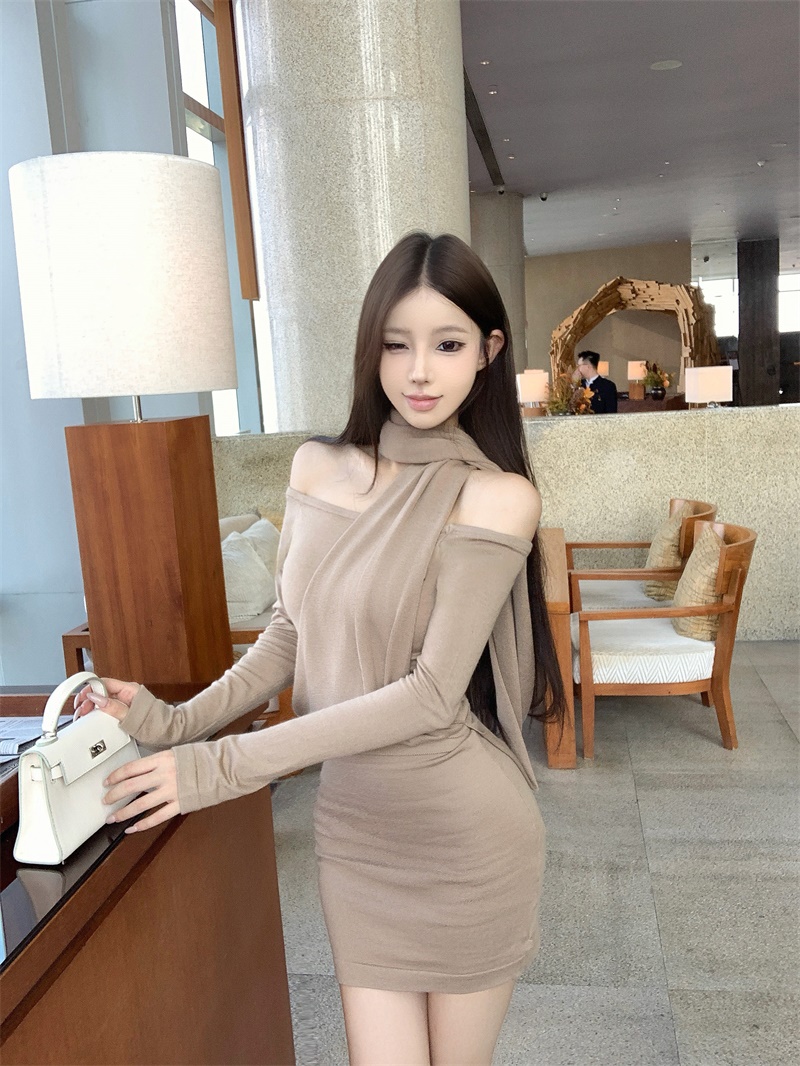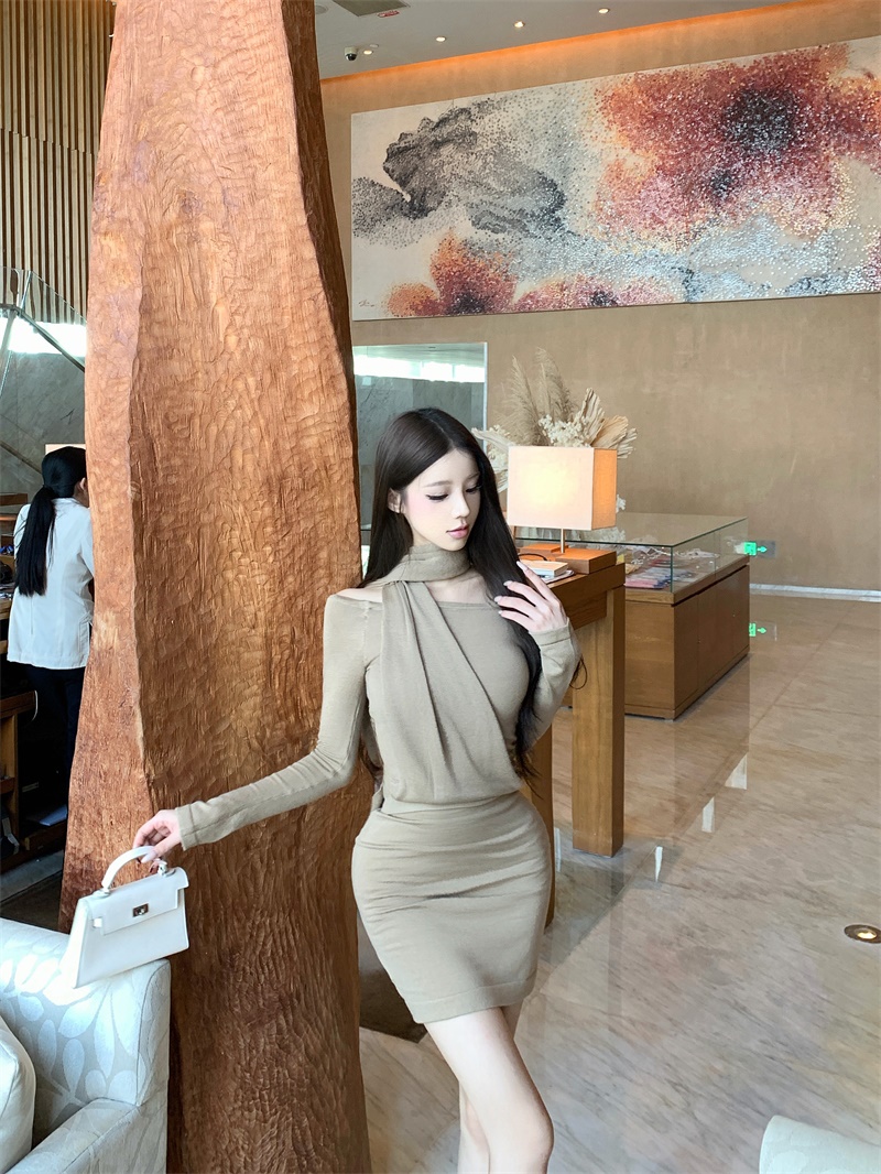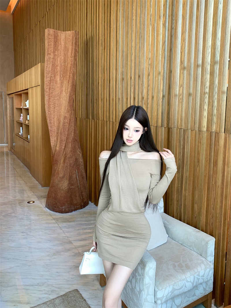 FA45866# 清冷美人收腰针织包臀裙长袖垂感连衣裙 服裝批發女裝批發服飾貨源
