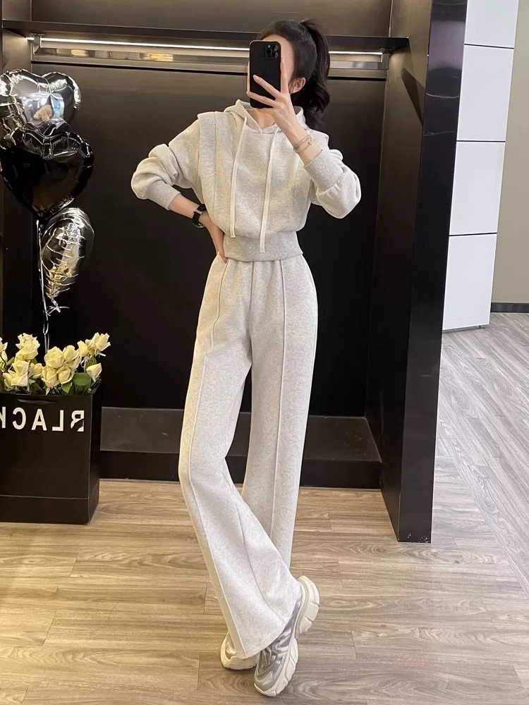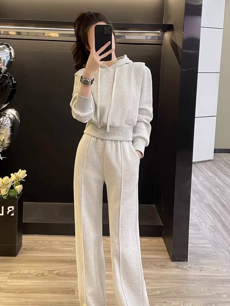 FA45870# 加绒加厚时尚休闲运动卫衣套装女冬季小个子连帽外套阔腿裤两件套 服裝批發女裝批發服飾貨源