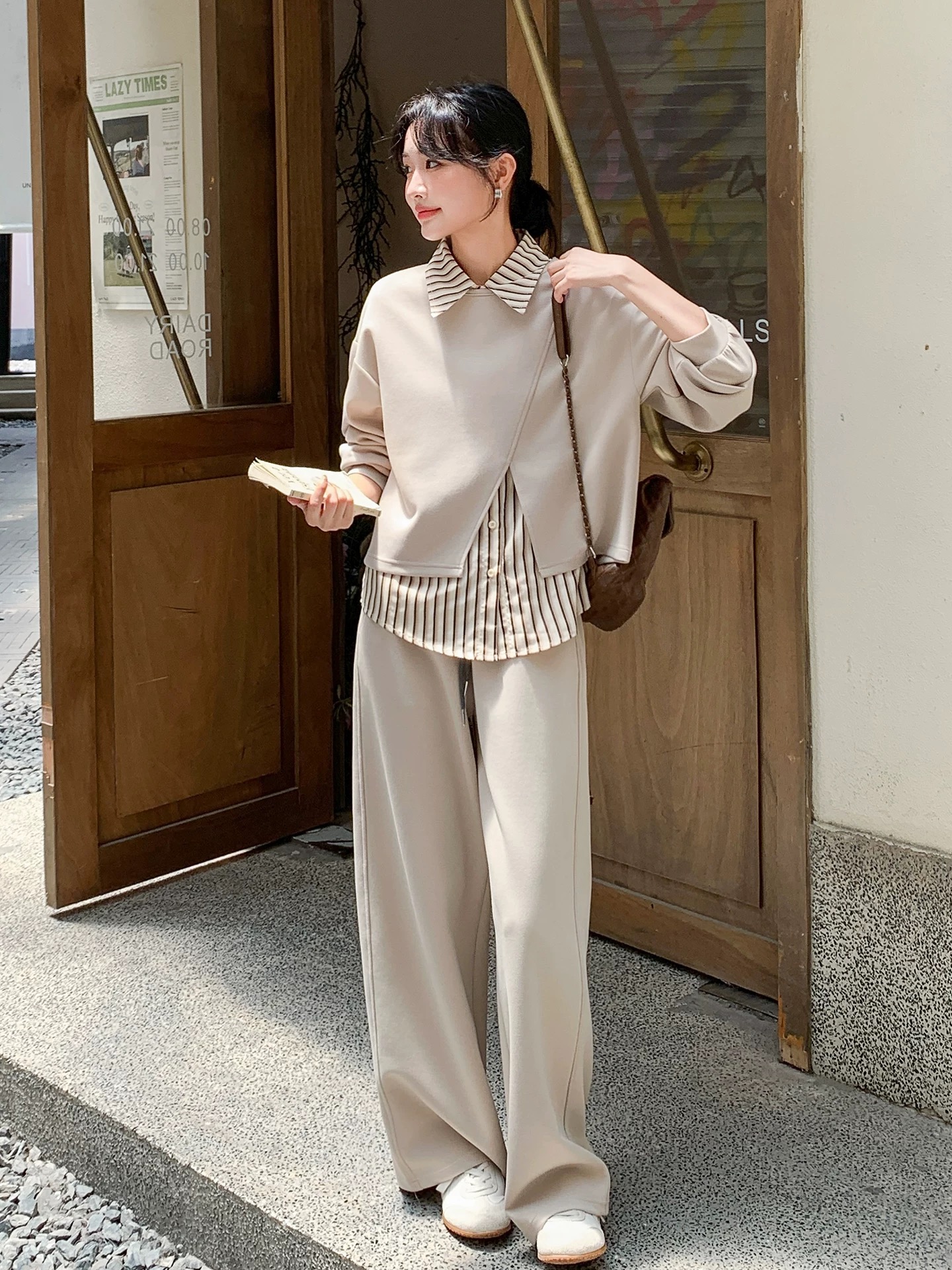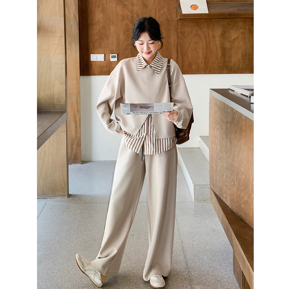 FA45872# 韩系休闲套装女秋季新款时髦条纹衬衫设计感上衣阔腿裤三件套 服裝批發女裝批發服飾貨源