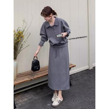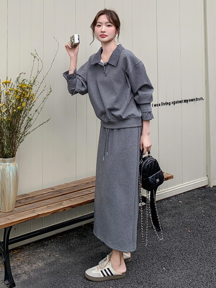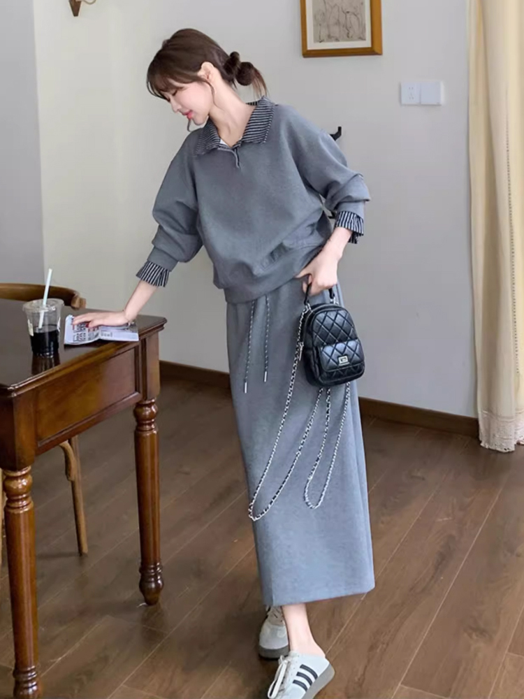 FA45874# 秋季韩系穿搭一整套女灰色假两件卫衣半身裙时尚休闲两件套装 服裝批發女裝批發服飾貨源