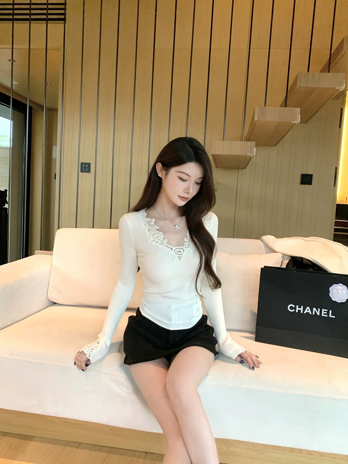 FA45879# 赫本芭蕾秋冬新款花边V领修身针织上衣打底毛衣女 服裝批發女裝批發服飾貨源
