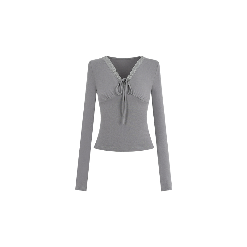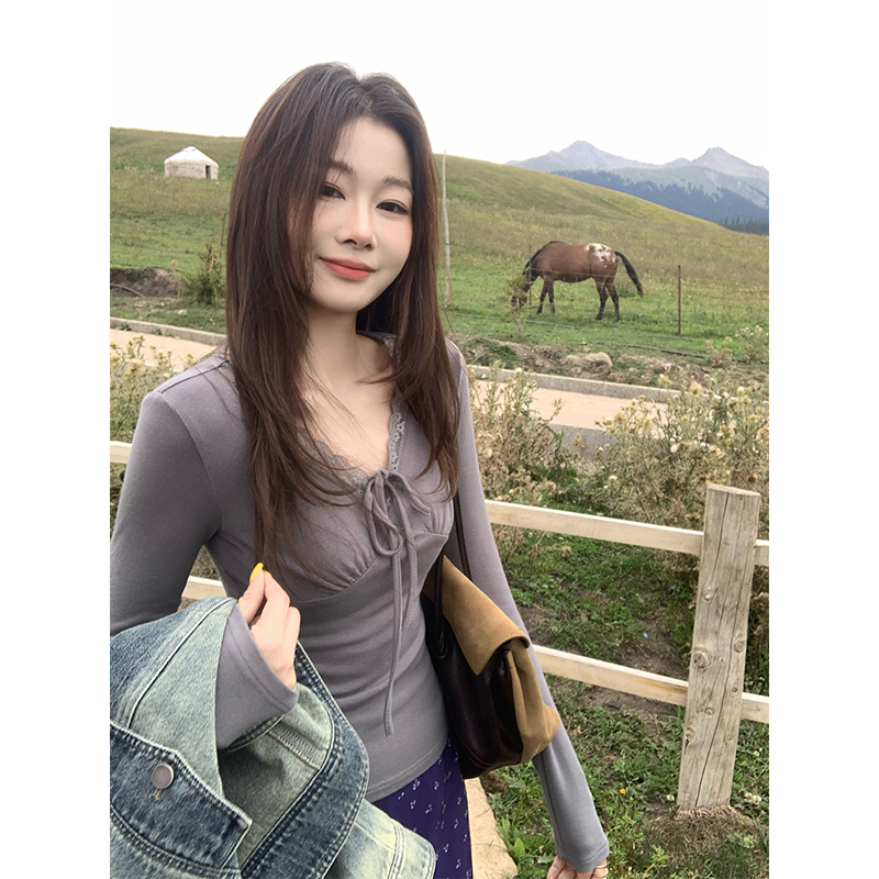 FA45889# EIA一尧甜心欧蕾纯欲气质上衣女秋新款设计感收腰V领长袖t恤 服裝批發女裝批發服飾貨源