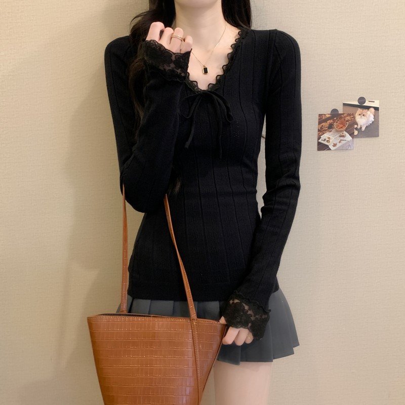 FA45894# 甜美风针织衫女秋季新款蕾丝边拼接蝴蝶结百搭修身上衣 服裝批發女裝批發服飾貨源