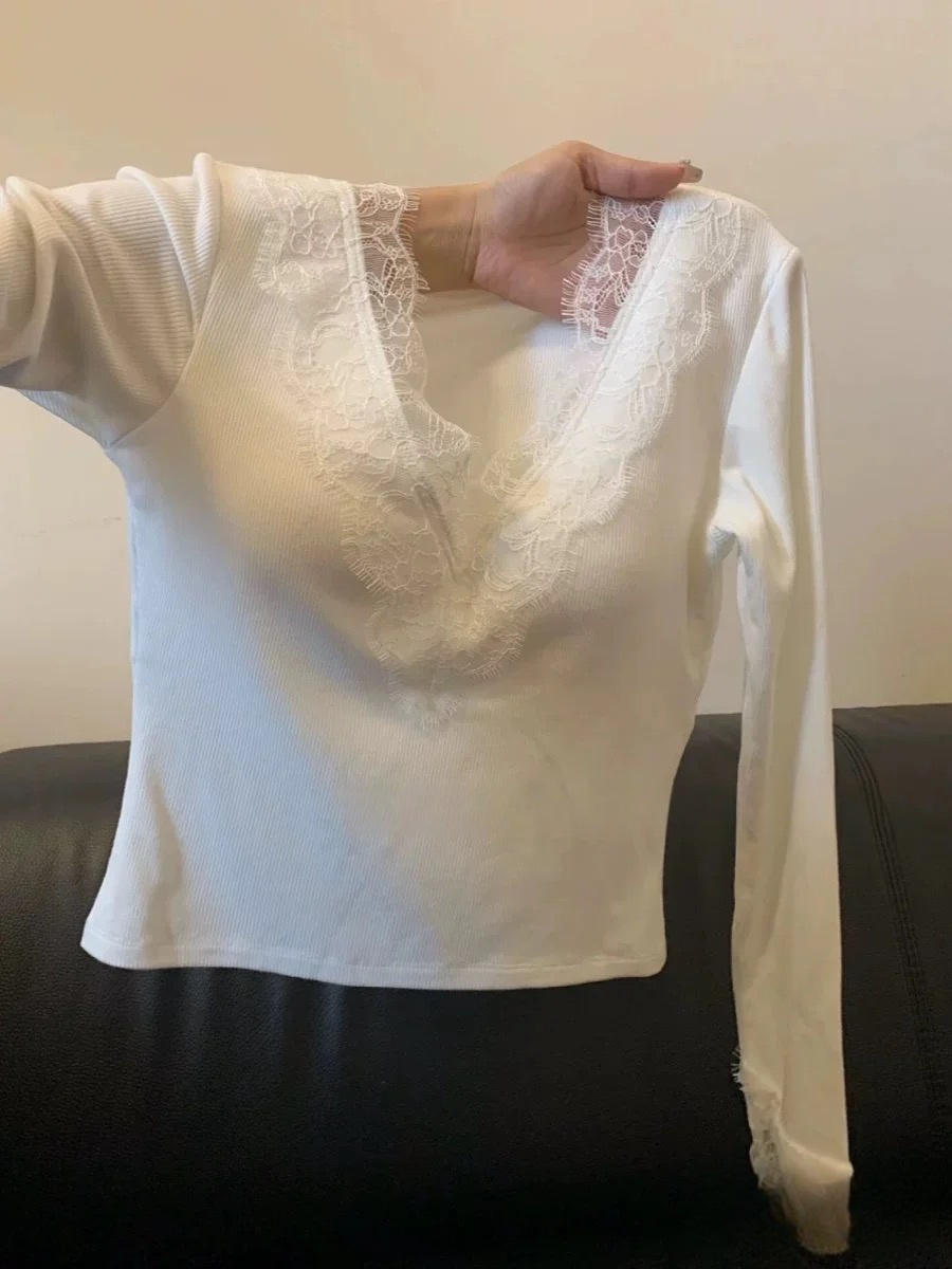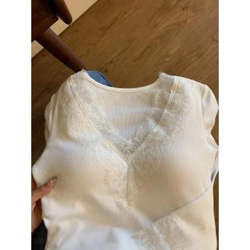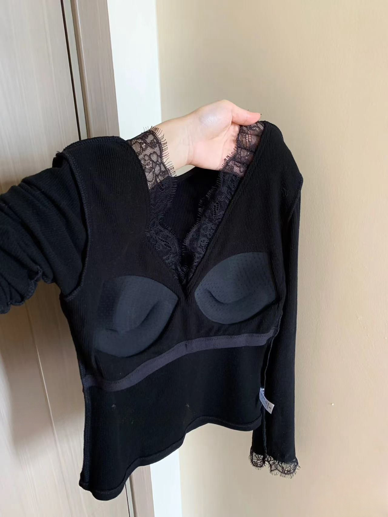 FA45906# 带胸垫秋冬纯欲蕾丝V领内搭打底衫女保暖长袖修身上衣 服裝批發女裝批發服飾貨源
