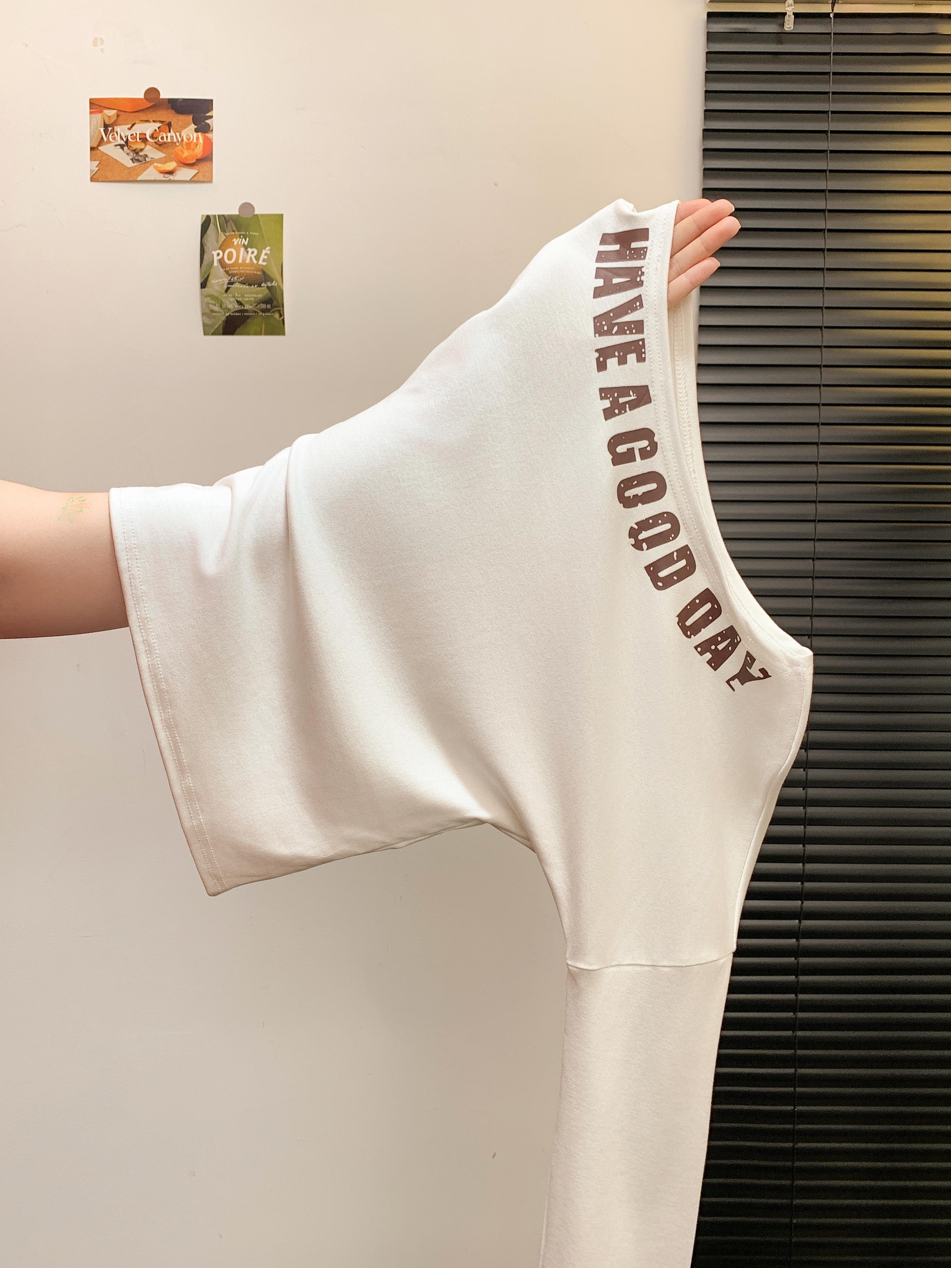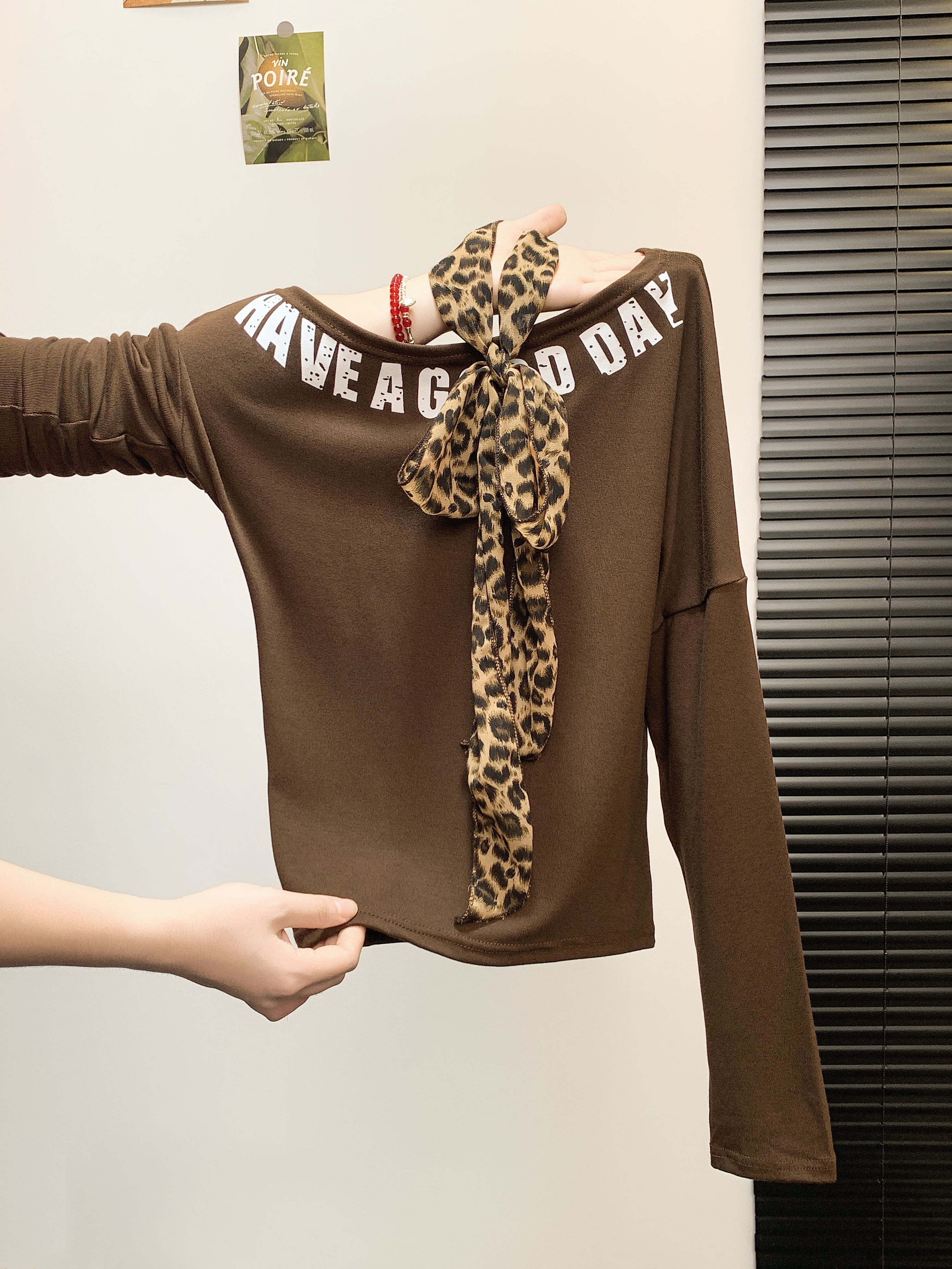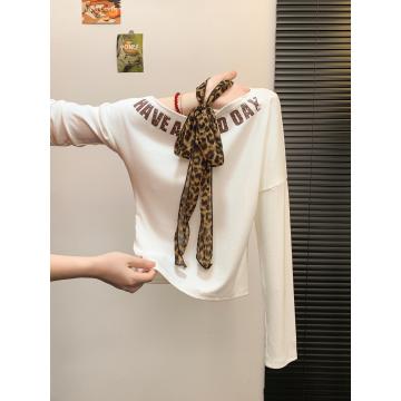FA45910# 美式复古辣妹风斜肩长袖T恤女设计感字母印花修身上衣配丝巾 服裝批發女裝批發服飾貨源