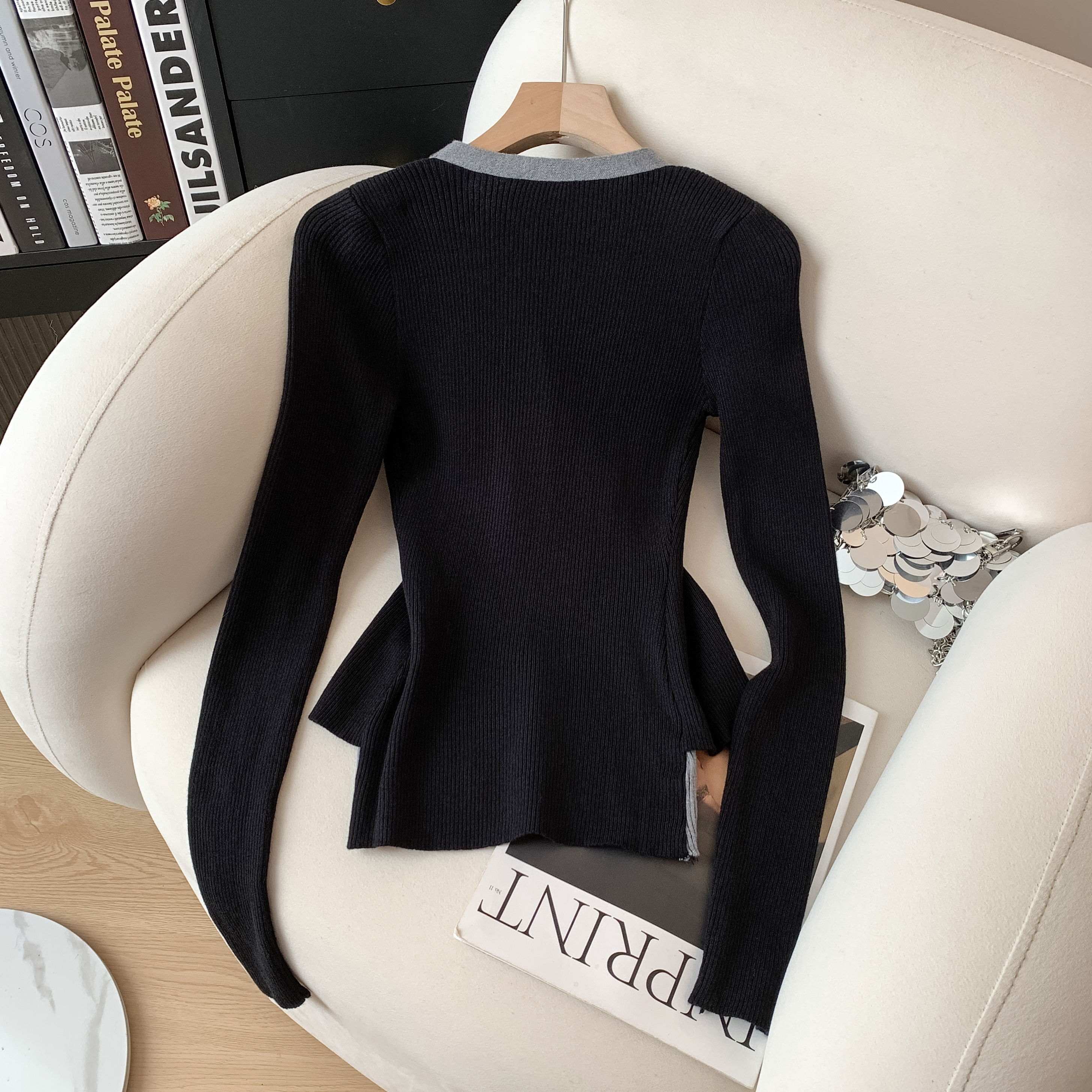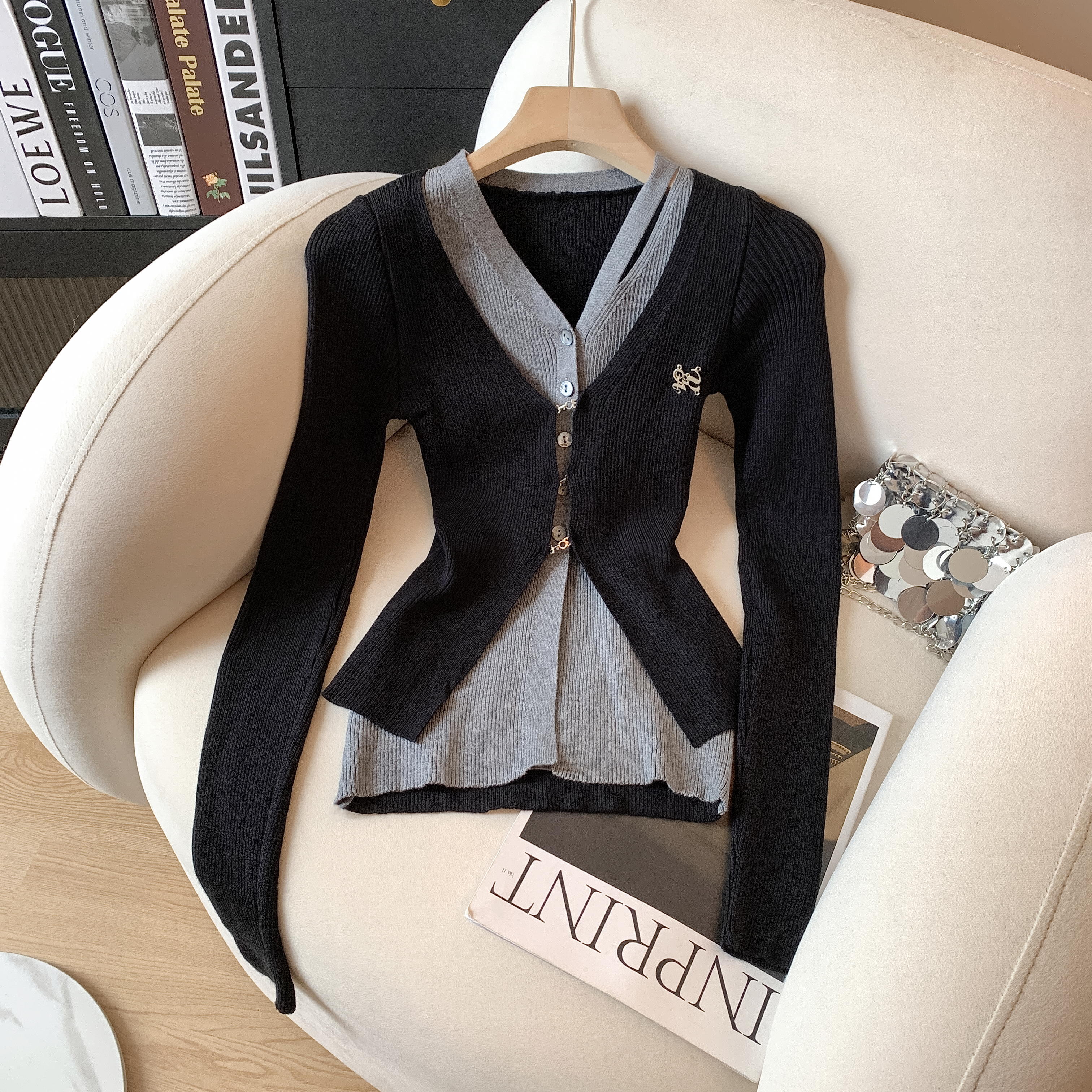 FA45911# 韩版复古独特别致v领修身长袖毛衣针织假两件开衫上衣女 服裝批發女裝批發服飾貨源