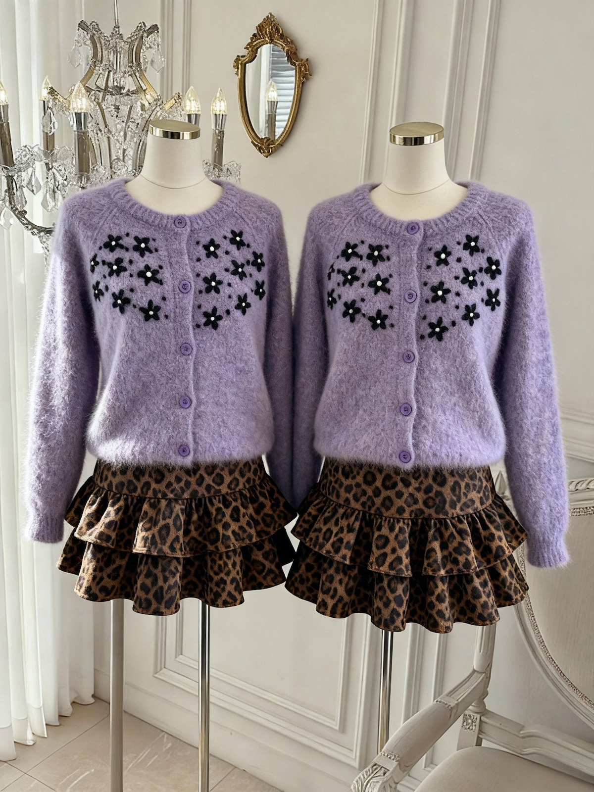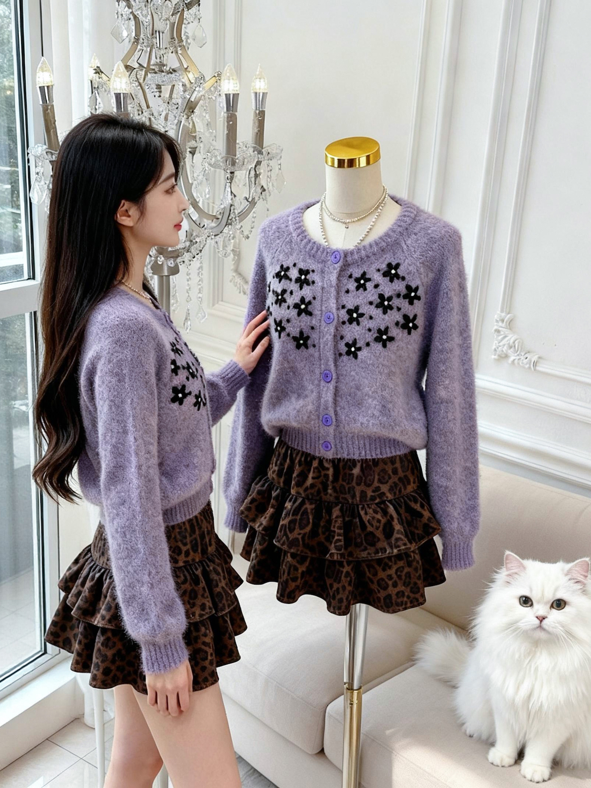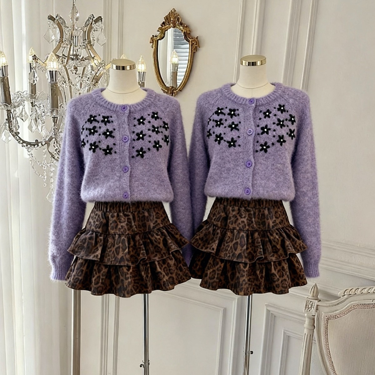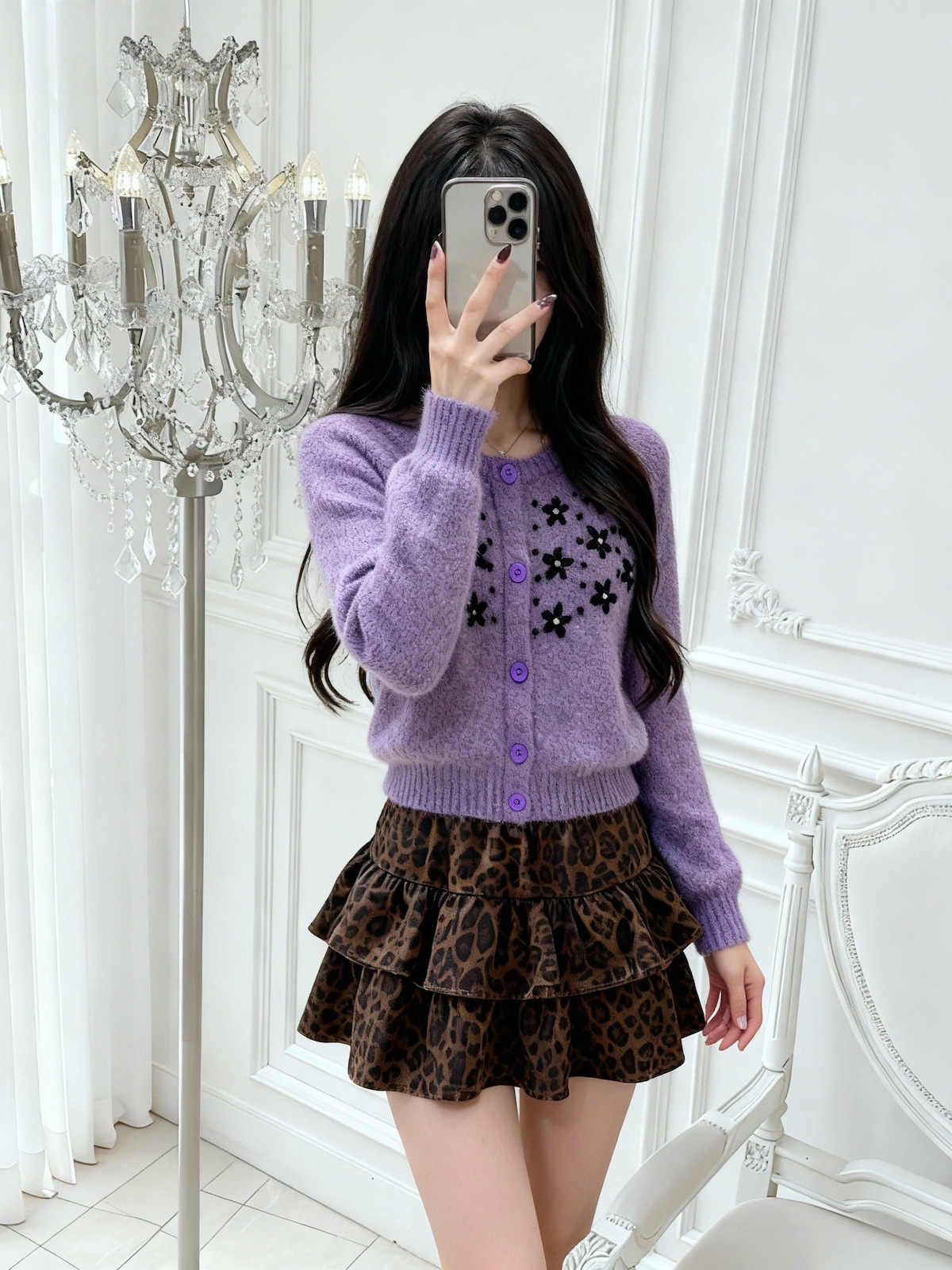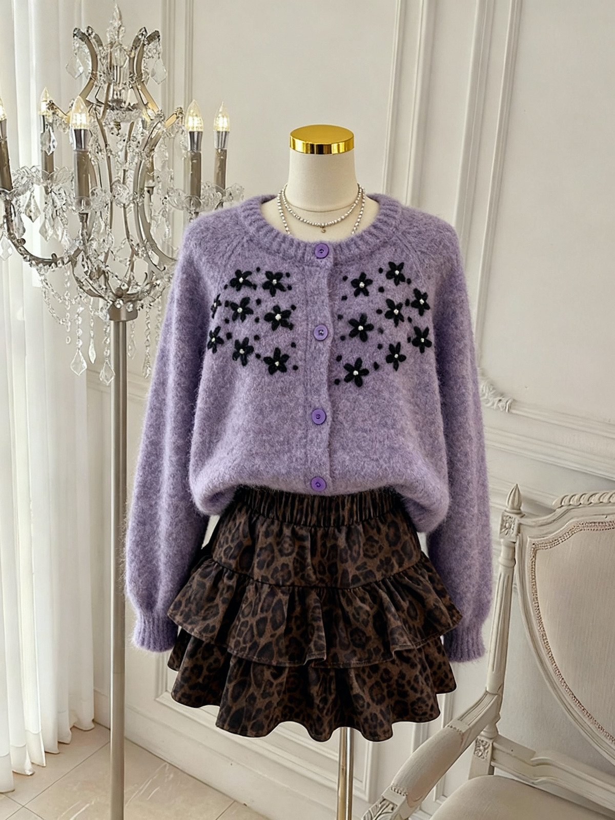 FA45928# 紫色圆领钩花针织开衫女秋冬宽松百搭软糯毛衣外套上衣 服裝批發女裝批發服飾貨源