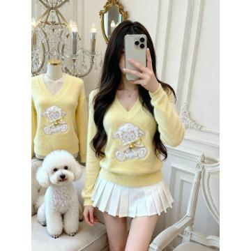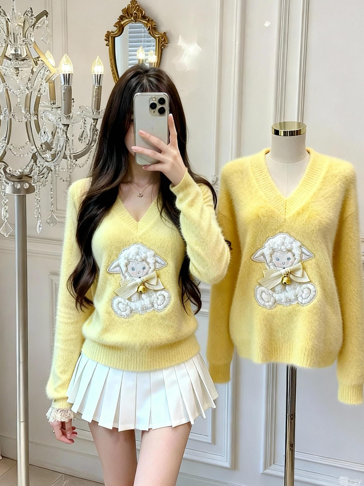 Home > 毛衣、针织衫 > FA45932# 软糯奶黄色蝴蝶结v领毛衣女冬季加厚宽松水貂绒针织上衣 服裝批發女裝批發服飾貨源
