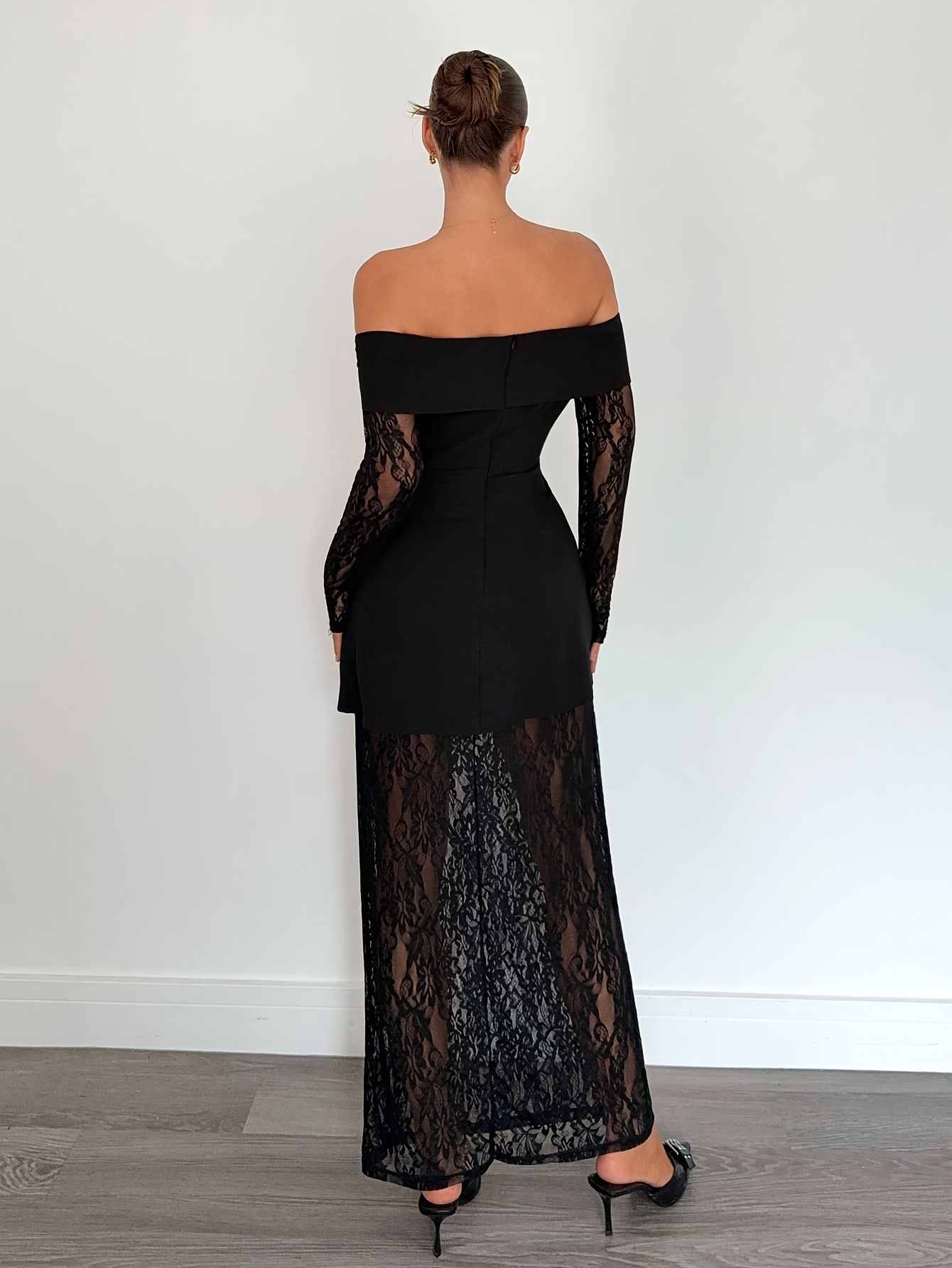 FA45980# 女士优雅性感净色蕾丝拼接露肩收腰长款连衣裙适合约会参加婚礼 服裝批發女裝批發服飾貨源