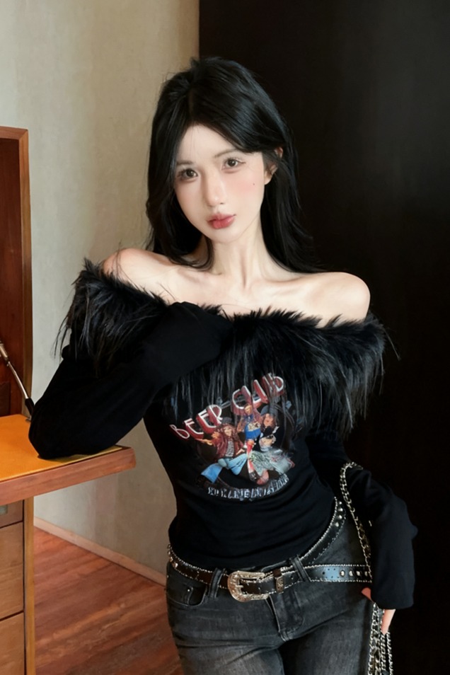 FA45991# 辣妹毛毛领长袖T恤针织印花修身显瘦上衣 服裝批發女裝批發服飾貨源