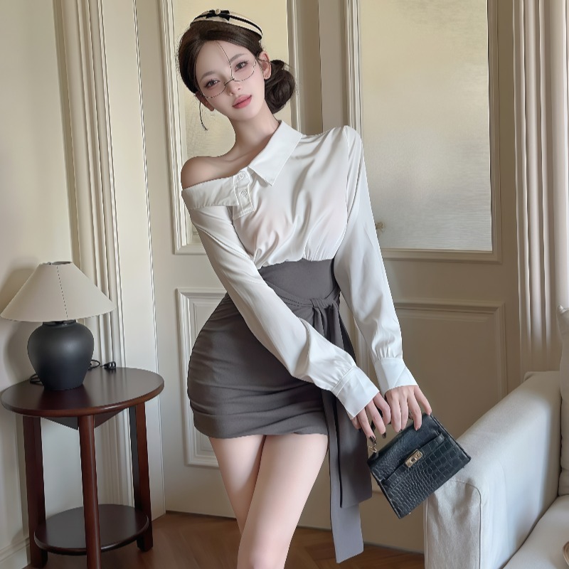 法式拼接假两件斜肩长袖衬衫连衣裙撞色收腰裙设计包臀裙 服裝批發女裝批發服飾貨源