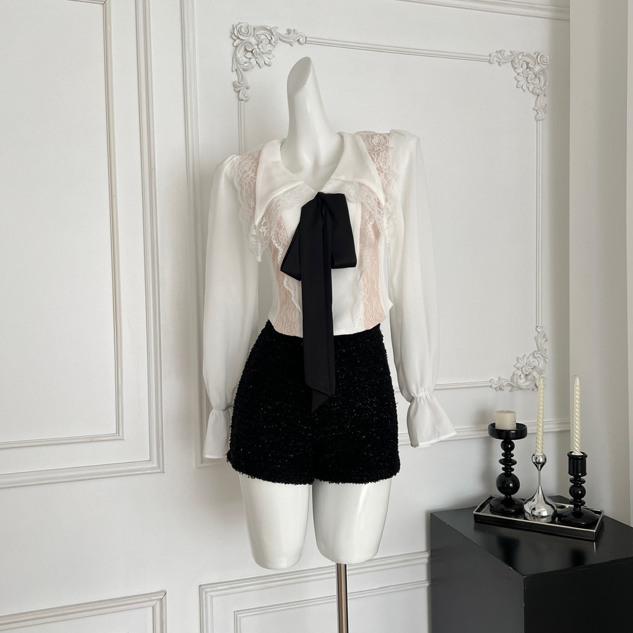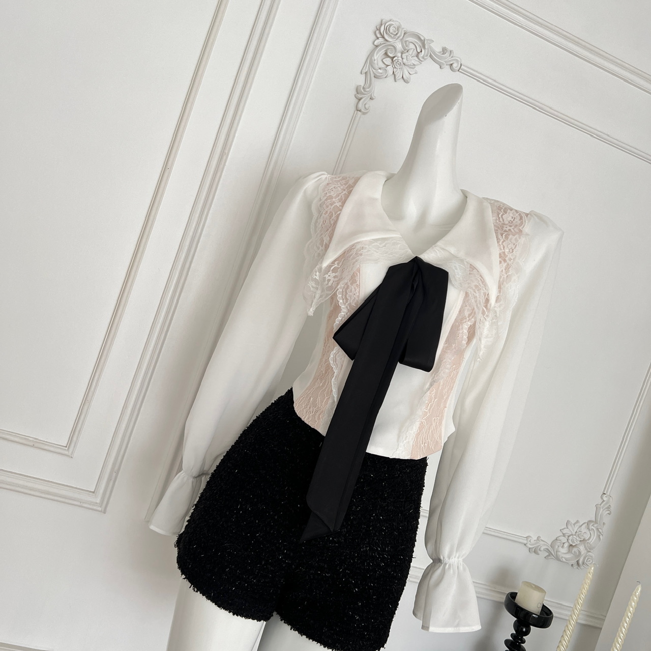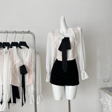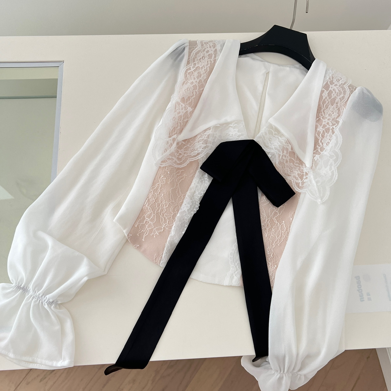 FA46088# 杏色短款长袖v领蕾丝衬衫女秋季内搭叠穿法式复古气质上衣 服裝批發女裝批發服飾貨源