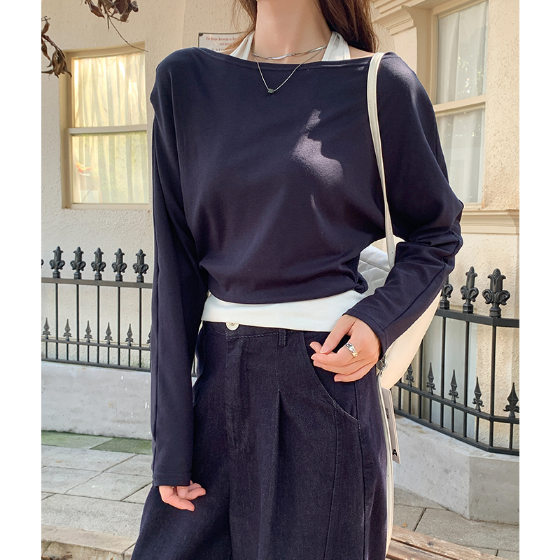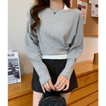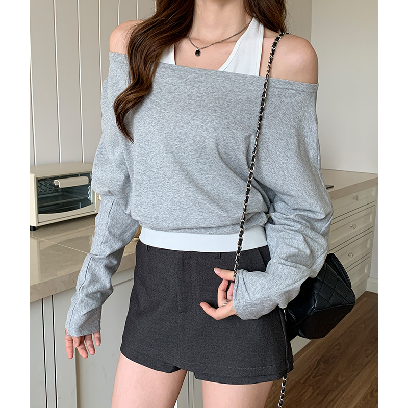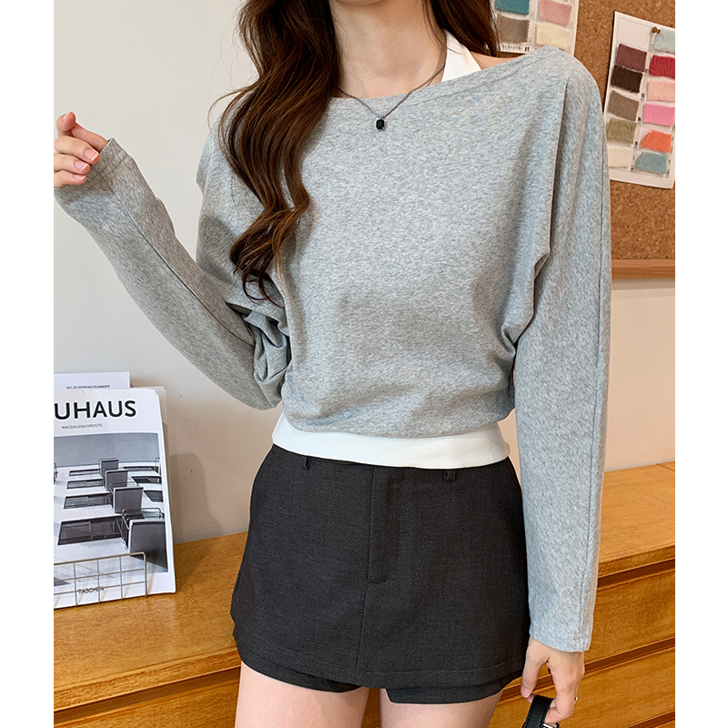 FA46096# 灰色斜肩挂脖假两件长袖t恤女秋季露肩宽松内搭打底衫 服裝批發女裝批發服飾貨源