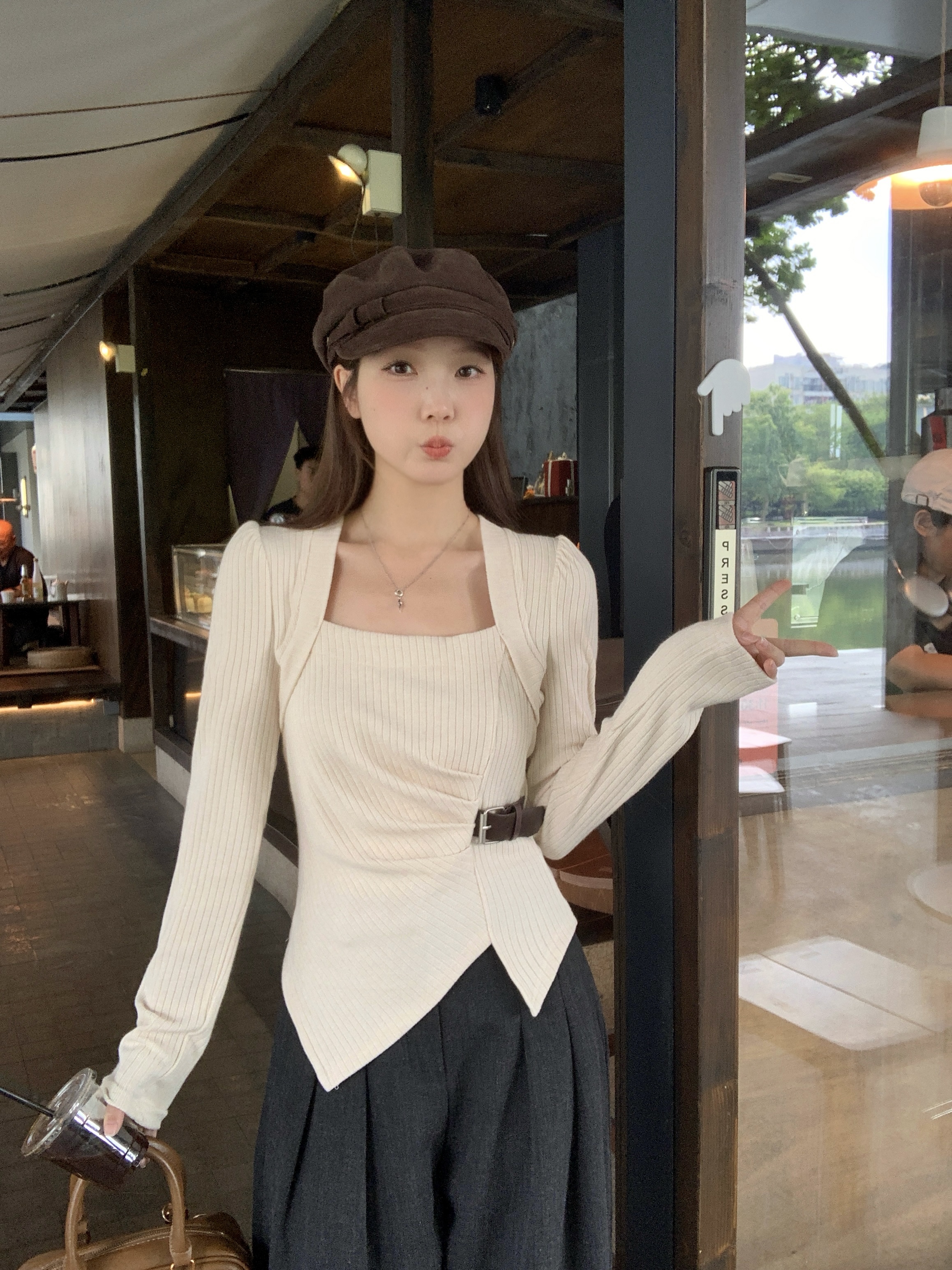 FA46137# 大码胖MM秋冬新款设计感方领不规则上衣收腰褶皱显瘦打底衫 服裝批發女裝批發服飾貨源