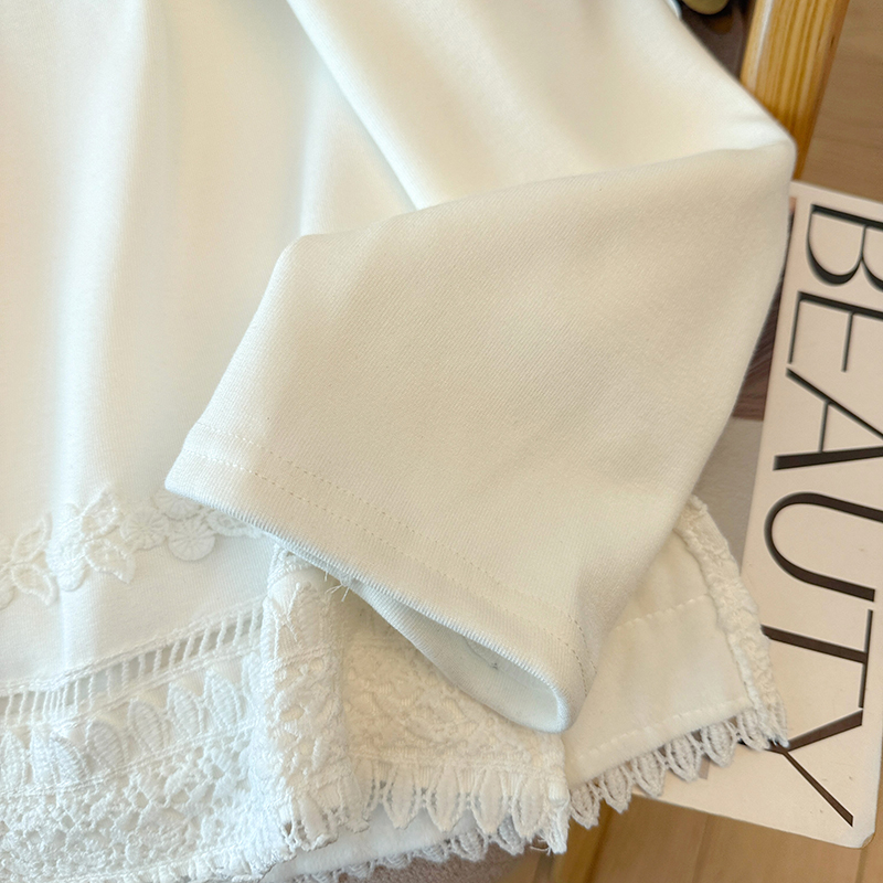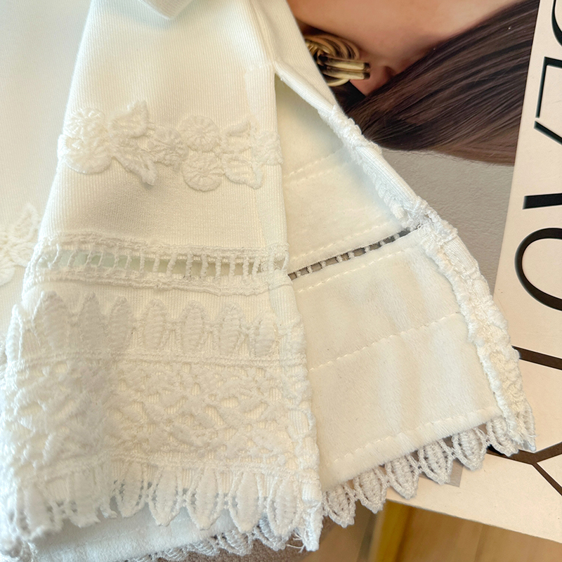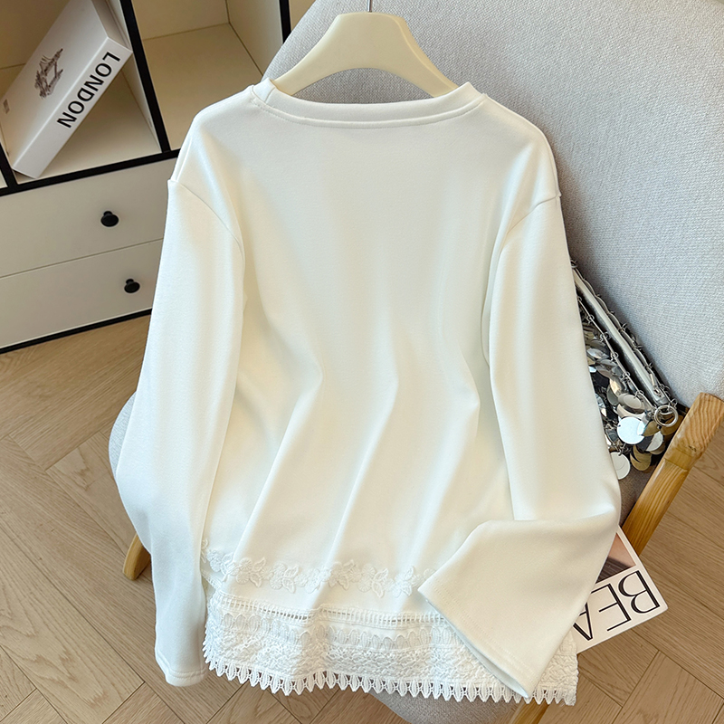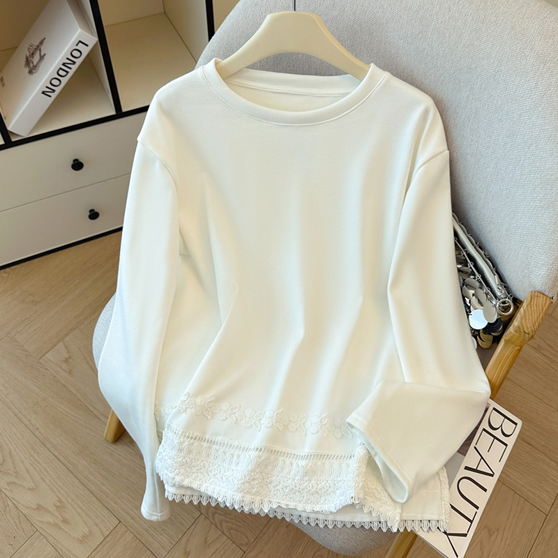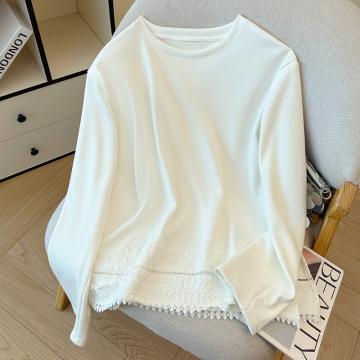 FA46337# 大码白色加厚宝宝绒蕾丝拼接T恤宽松打底外穿长袖上衣 服裝批發女裝批發服飾貨源