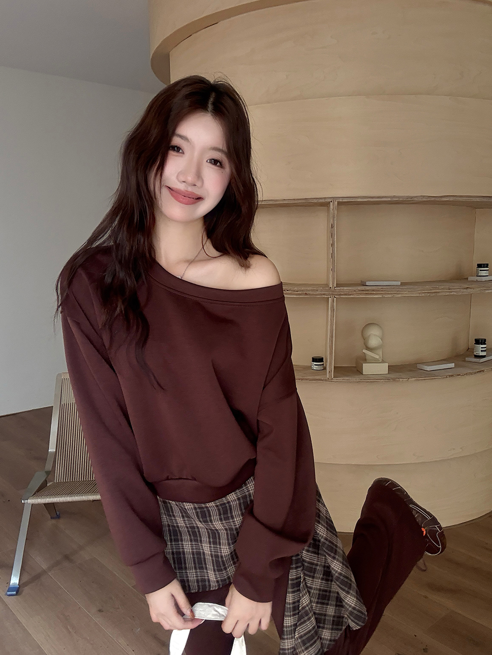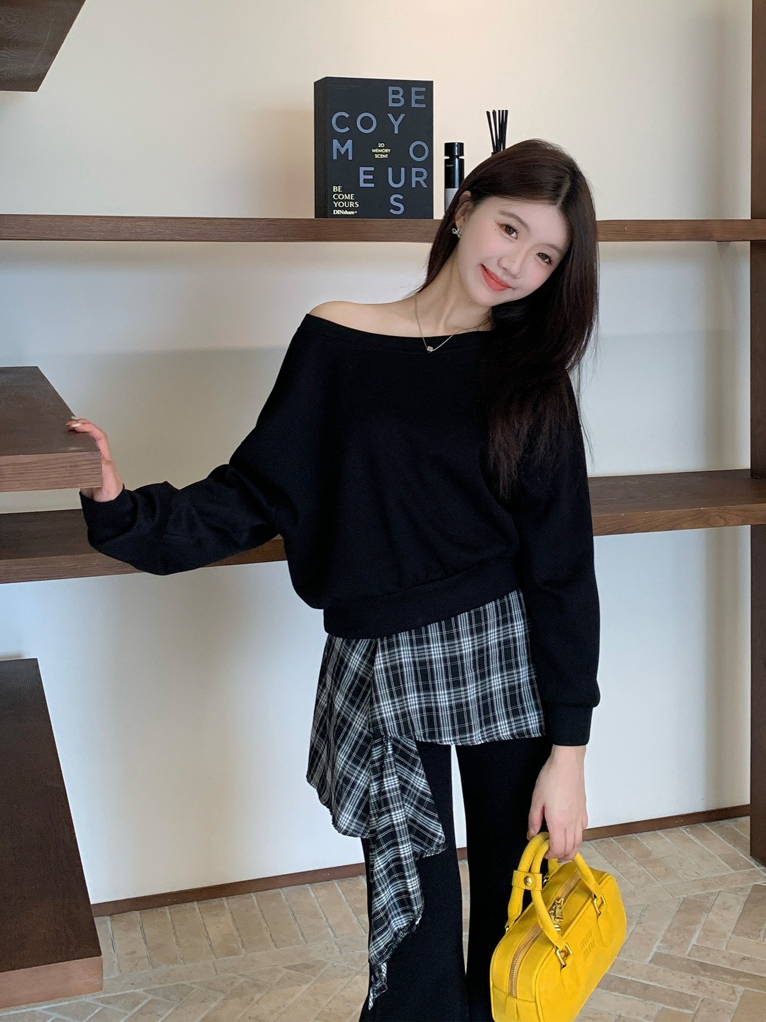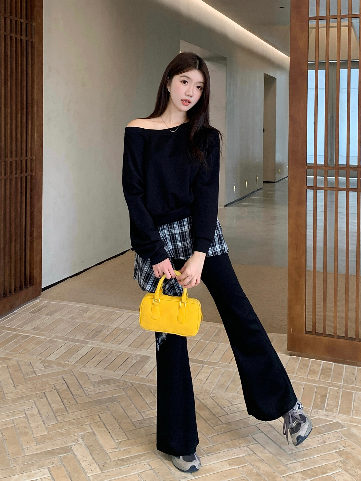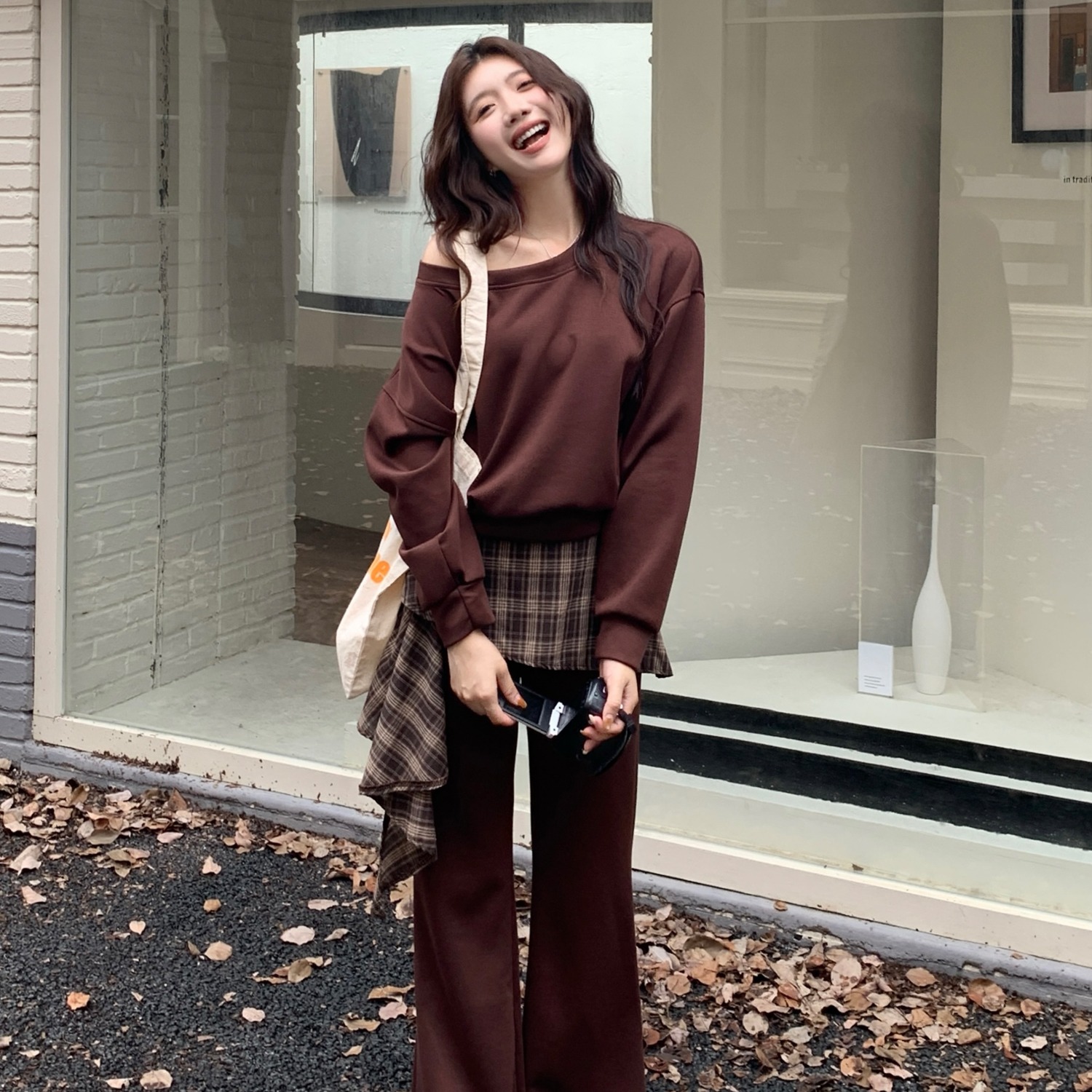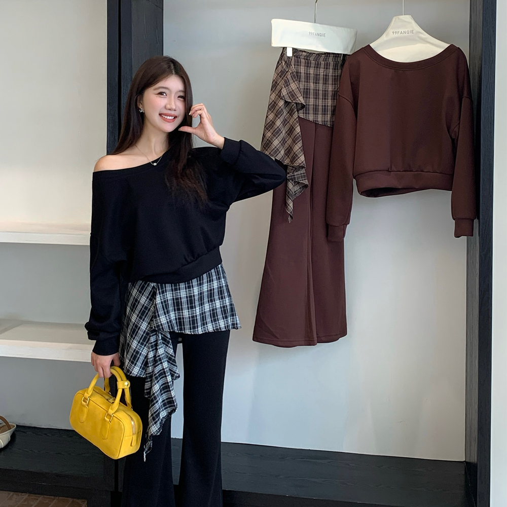 FA46429# 大码高级感斜肩卫衣女复古胖MM高腰微喇裤套装 服裝批發女裝批發服飾貨源