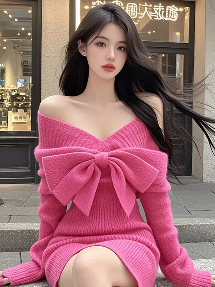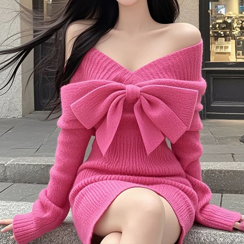 FA46518# V领蝴蝶结长袖针织衫连衣裙女秋季性感收腰包臀裙