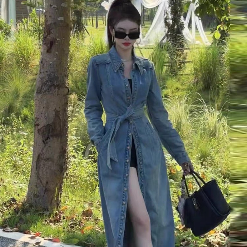 FA46540# 复古单排扣长款翻领牛仔风衣外套女秋冬新款系带收腰显瘦气质大衣