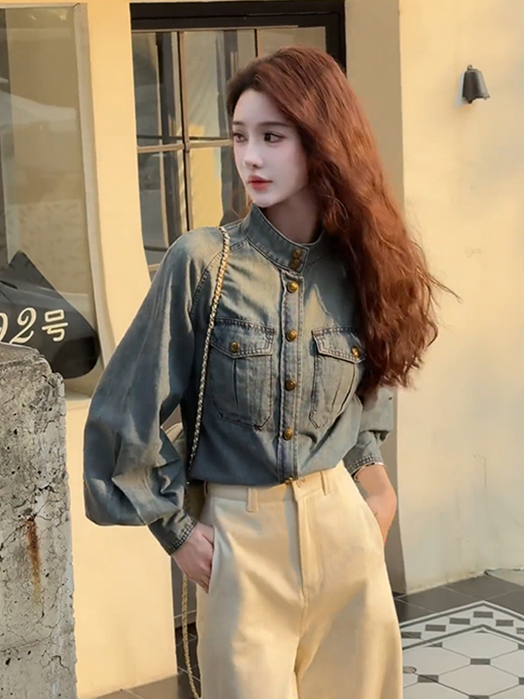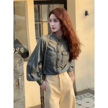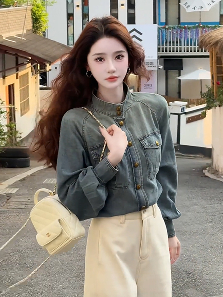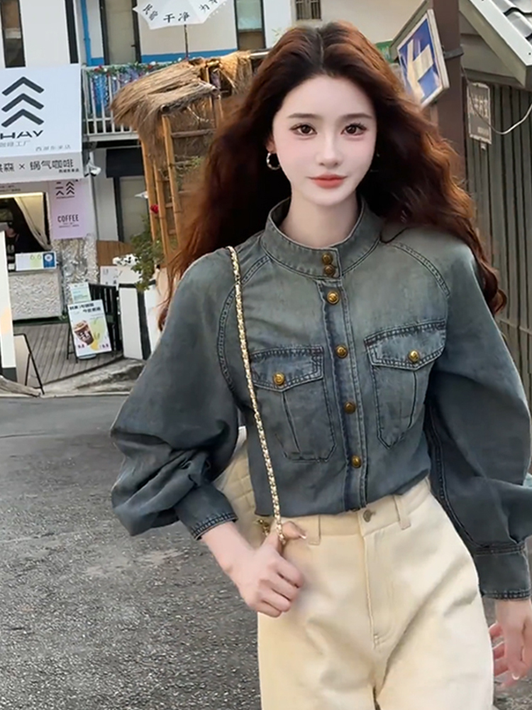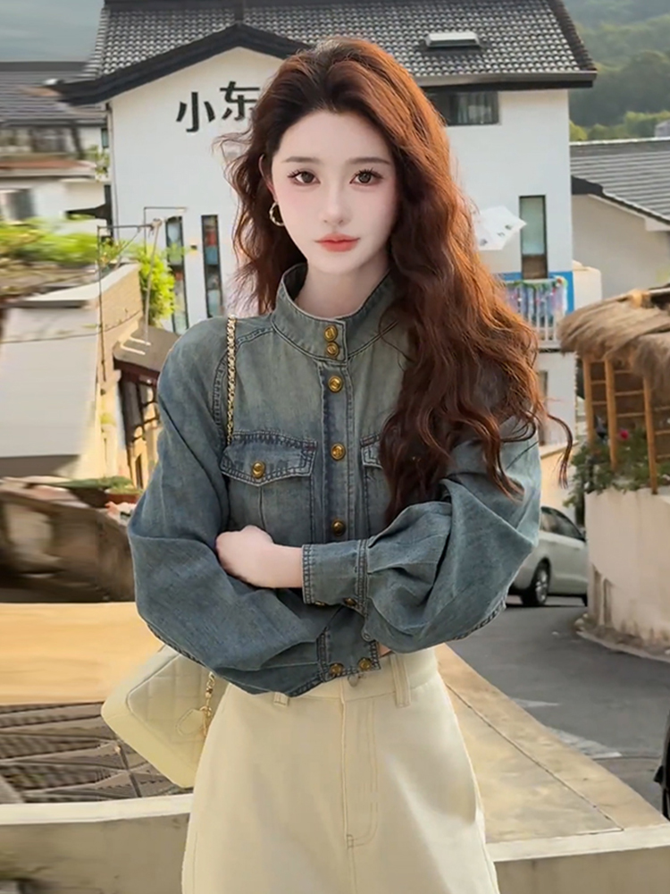 FA46541# 复古小香风立领牛仔外套女早秋春装新款设计感漂亮夹克衫上衣