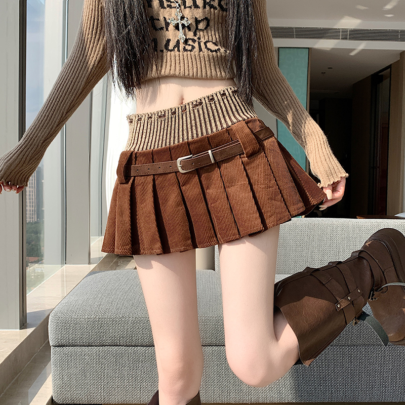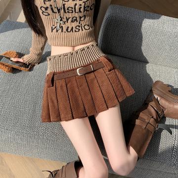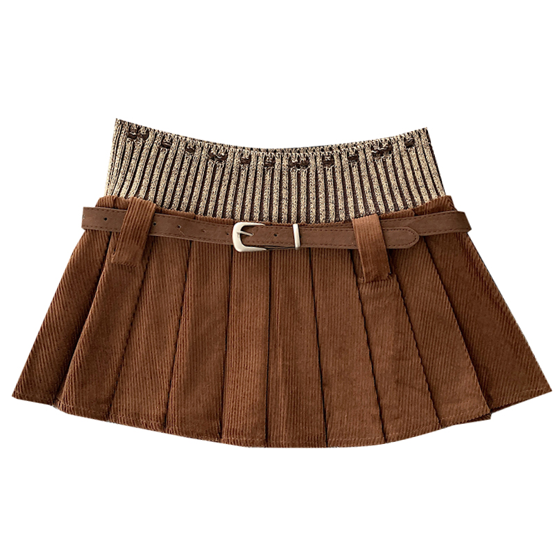秋冬新款针织拼接灯芯绒高腰显瘦设计感百褶a字半身裙 服裝批發女裝批發服飾貨源