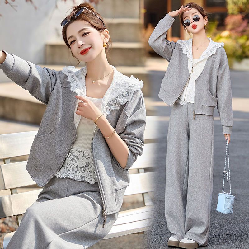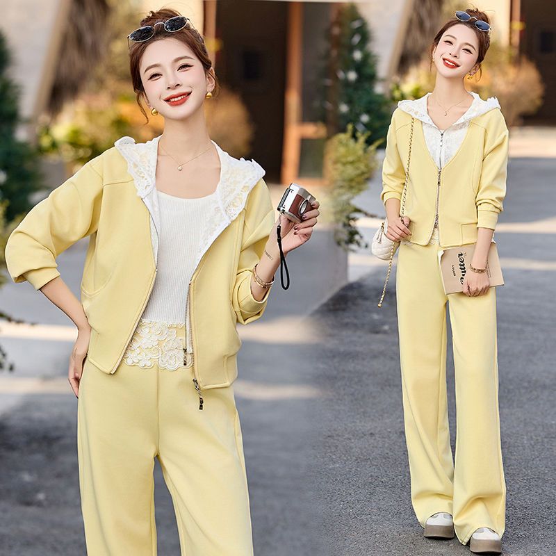 时尚休闲新款卫衣连帽拉链外套假两件休闲阔腿直筒裤套装 服裝批發女裝批發服飾貨源