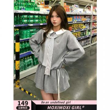 秋季灰色假两件长袖卫衣连衣裙条纹披肩韩系气质短裙女 服裝批發女裝批發服飾貨源
