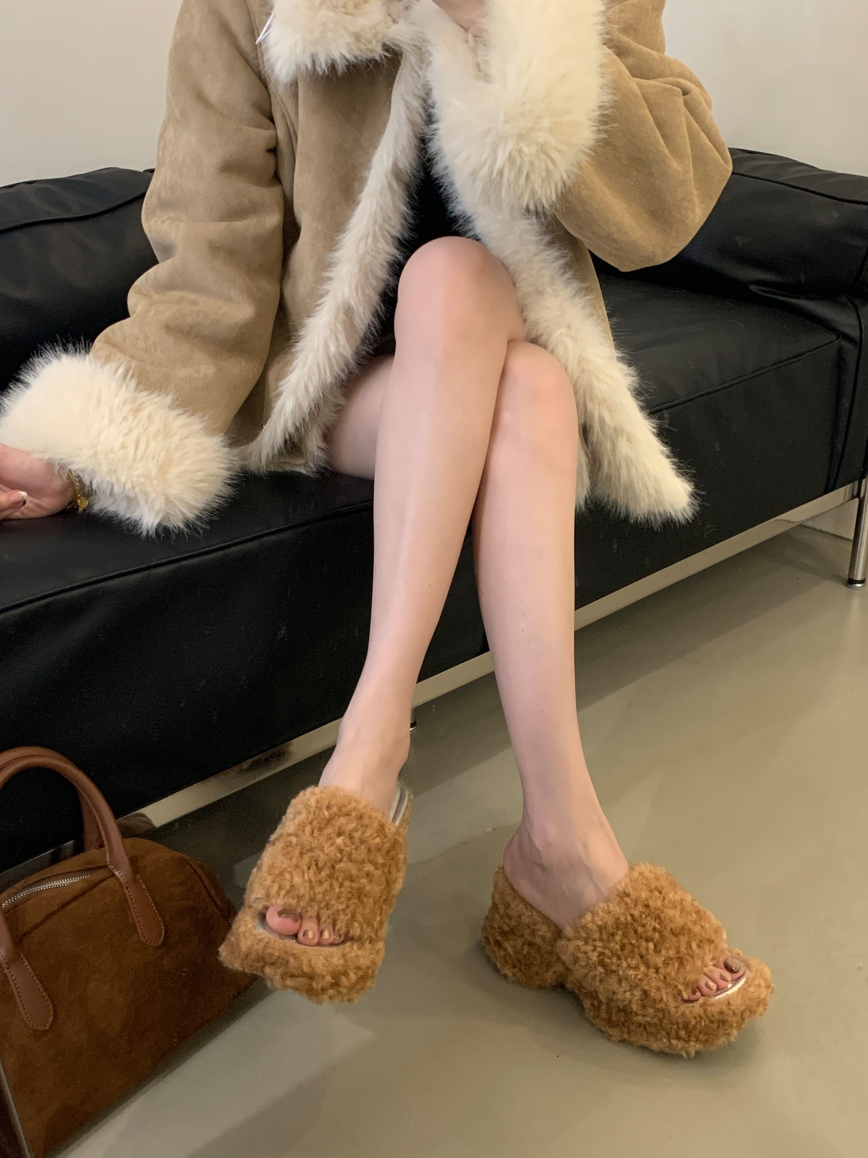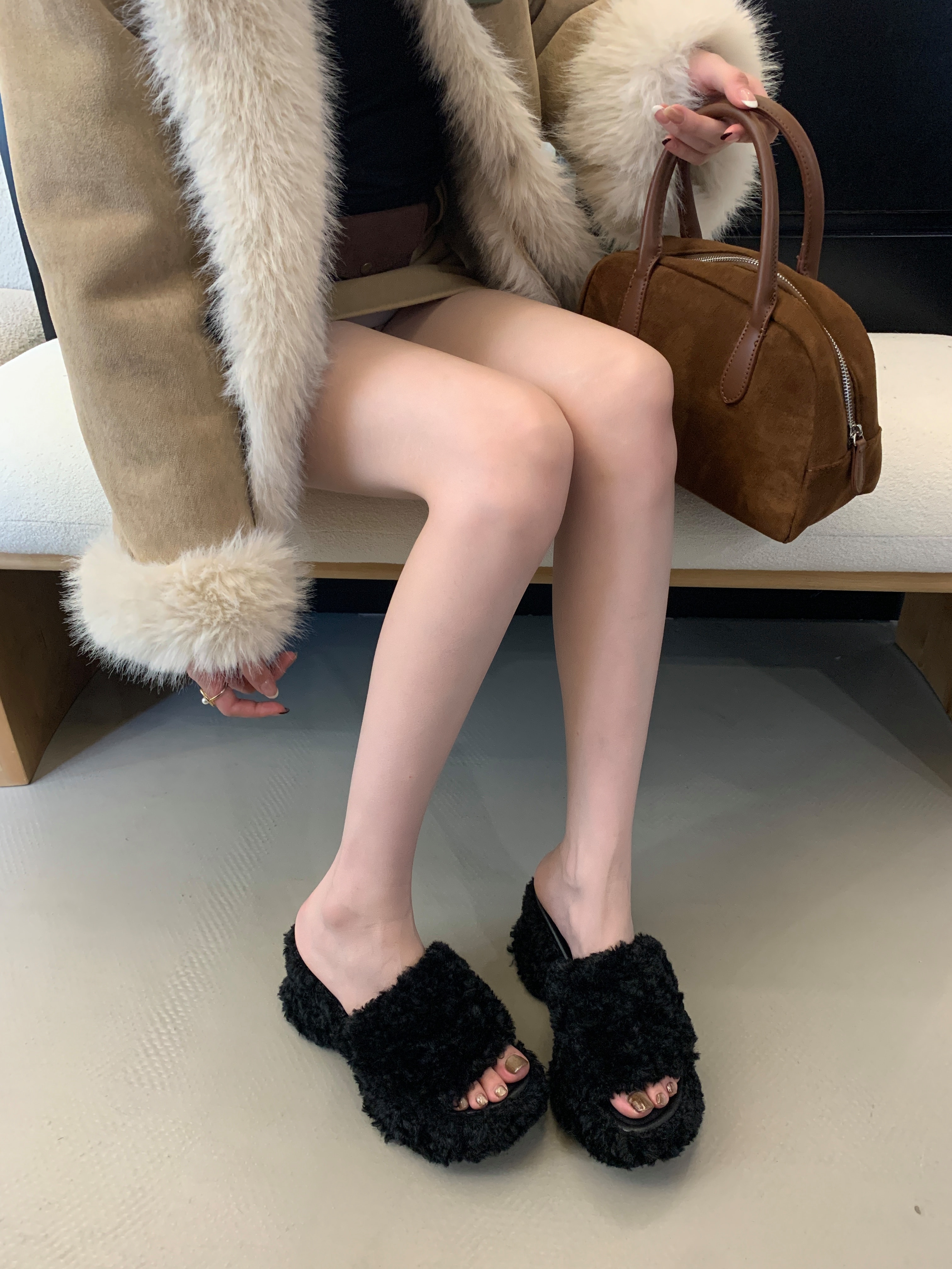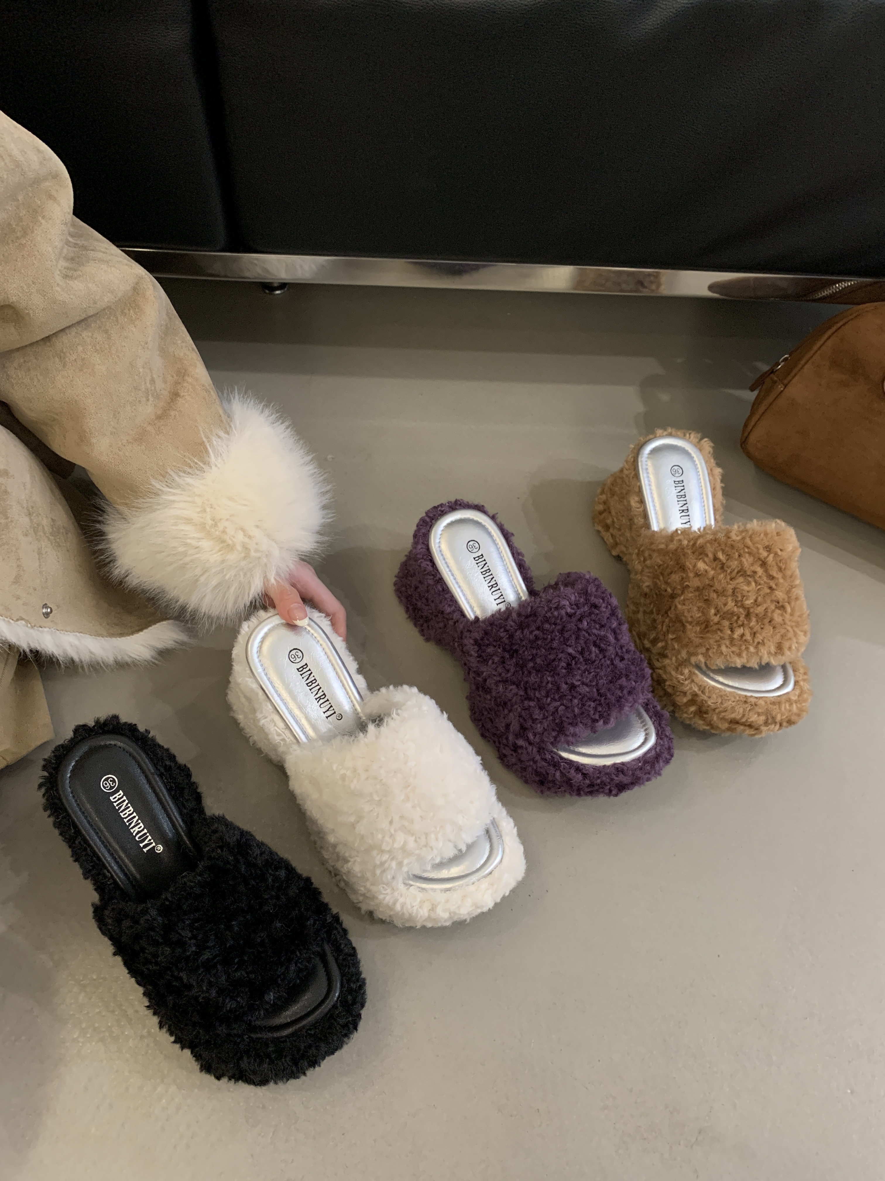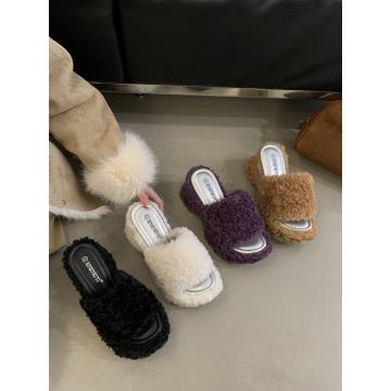 X-32862# 巨显腿长坡跟露趾一字毛毛拖鞋女秋冬外穿松糕厚底高跟凉拖鞋 鞋子批发女鞋批发货源