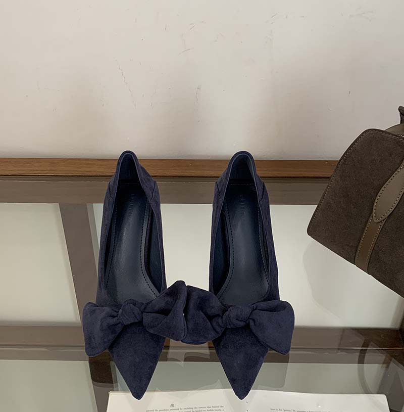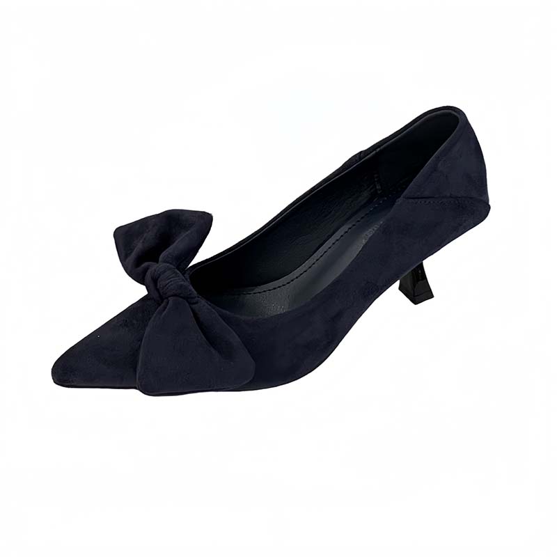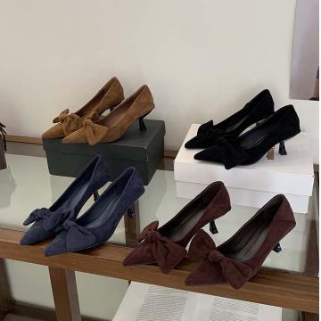 X-32865# 秋季新款尖头绒面蝴蝶结复古高跟鞋女时尚百搭细跟通勤单鞋 鞋子批发女鞋批发货源