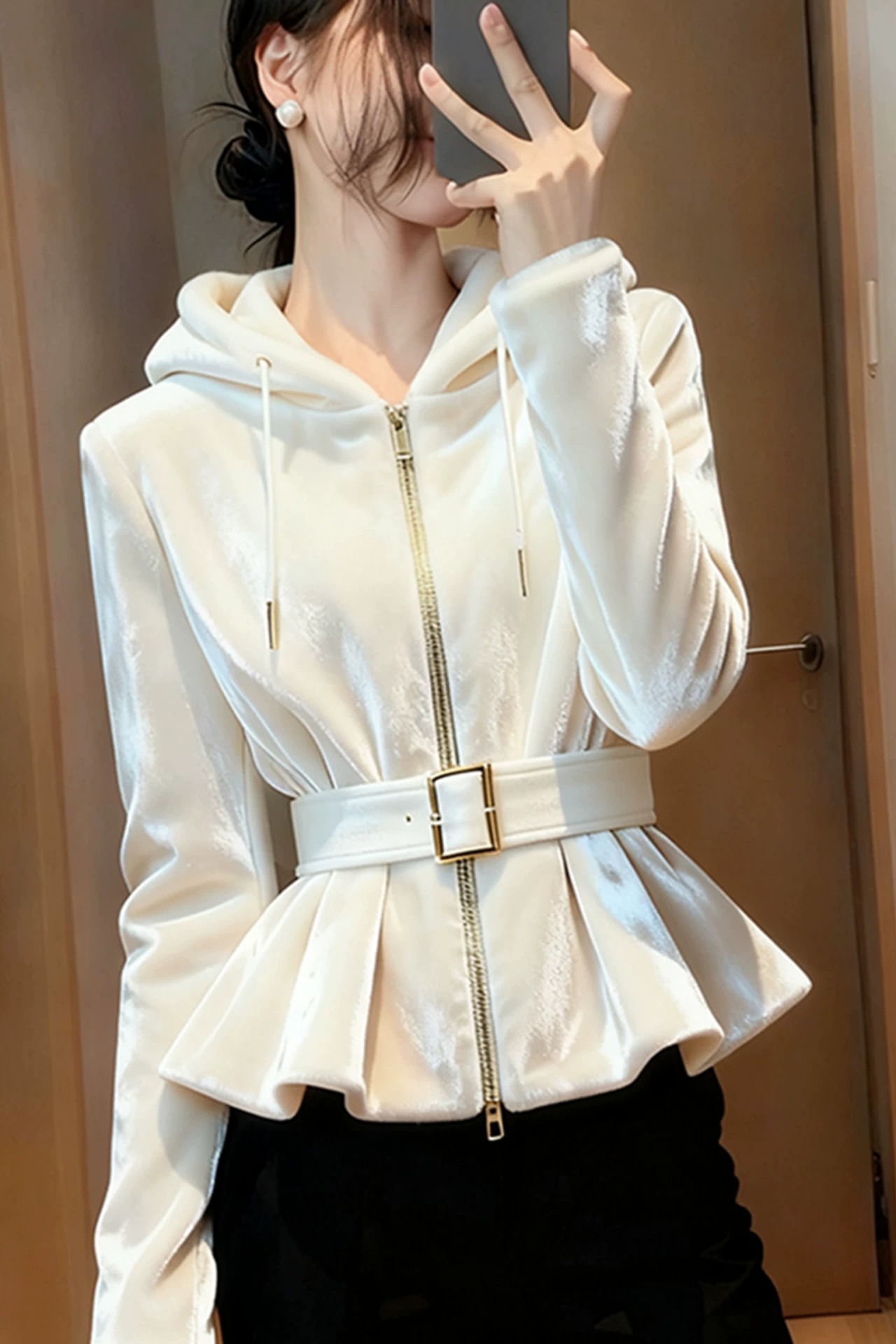 FA47276# 白色连帽丝绒外套女新款秋冬独特漂亮气质高端收腰上衣 服裝批發女裝批發服飾貨源