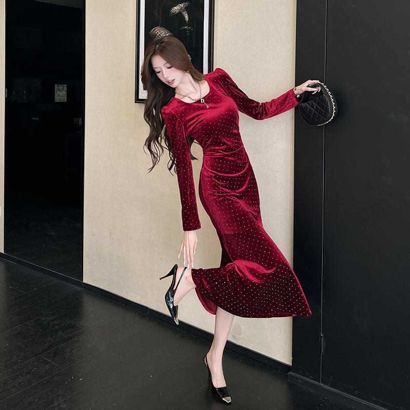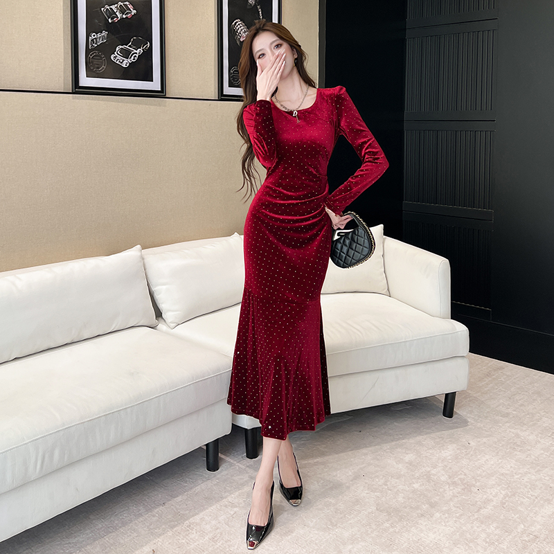 FA47997# 视频秋季长袖新款金丝绒长裙包臀连衣裙 服裝批發女裝批發服飾貨源