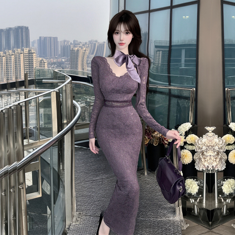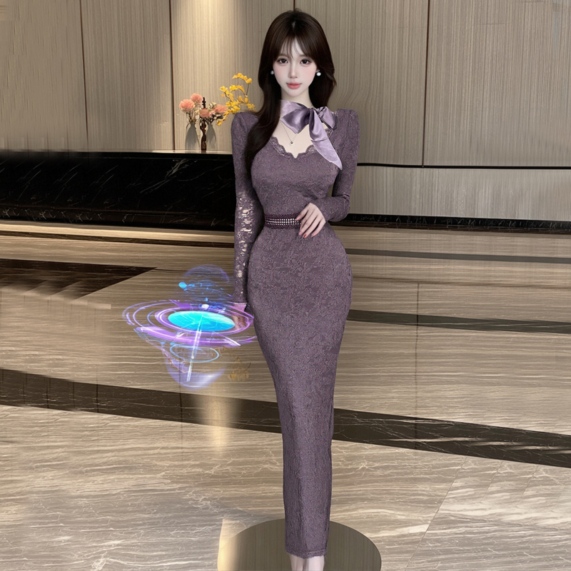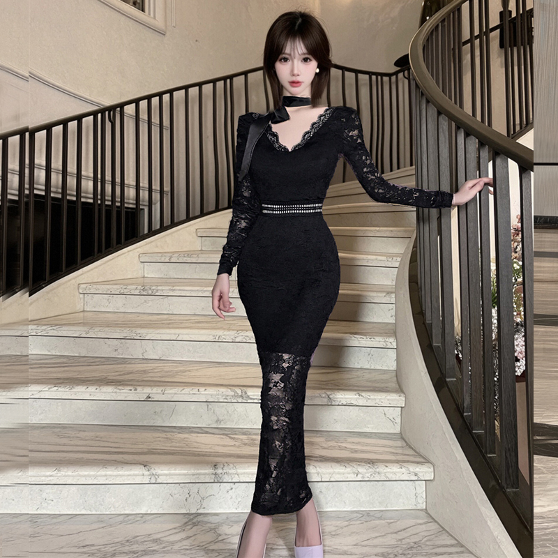 FA48158# 新款修身显瘦中长款包臀长袖蕾丝V领连衣裙 服裝批發女裝批發服飾貨源