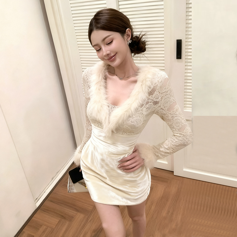 FA48165# 纯欲毛领蕾丝拼接长袖连衣裙女秋季修身显瘦百搭包臀短裙 服裝批發女裝批發服飾貨源