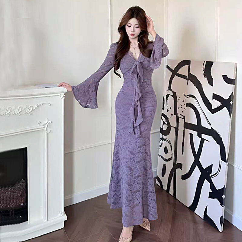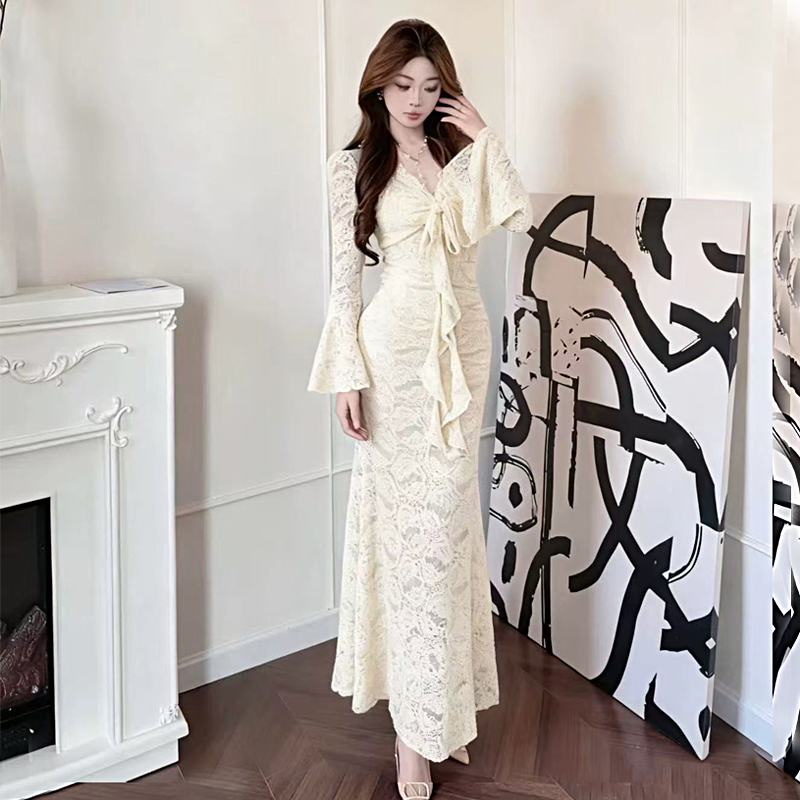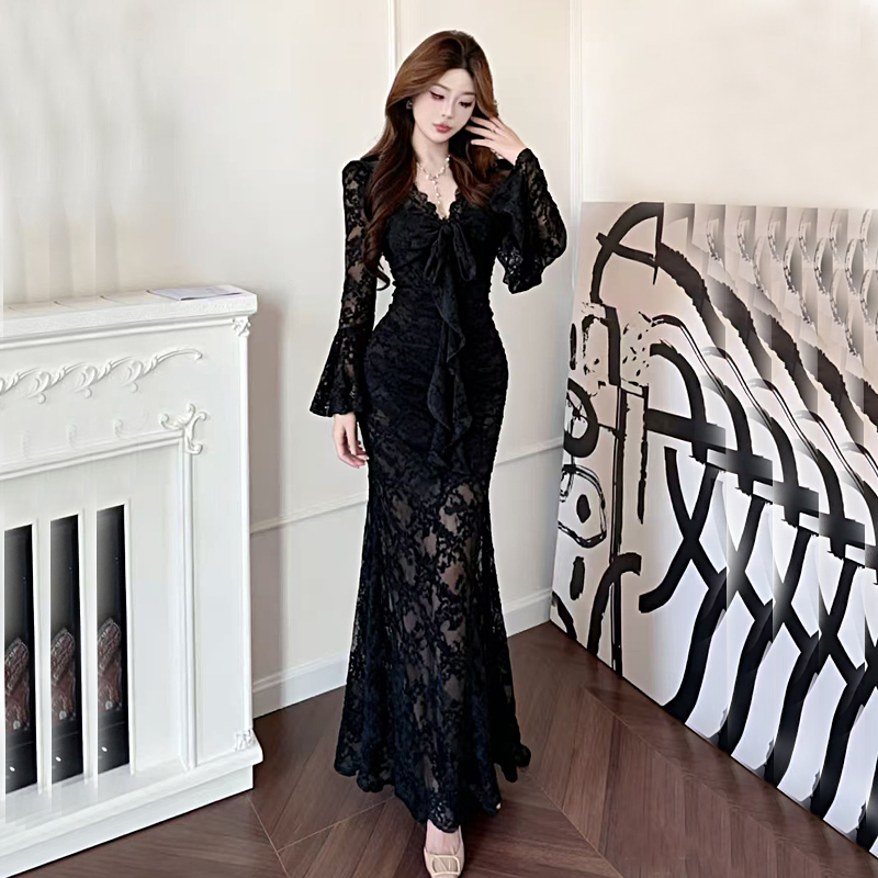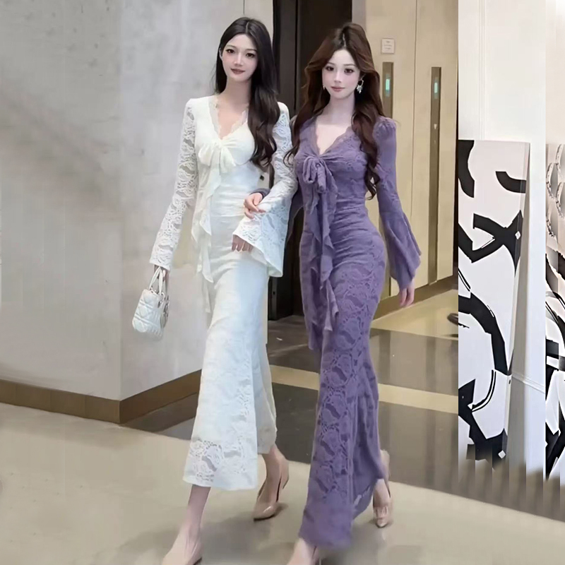 FA48172# 新款修身显瘦中长款包臀鱼尾裙蕾丝方领连衣裙 服裝批發女裝批發服飾貨源
