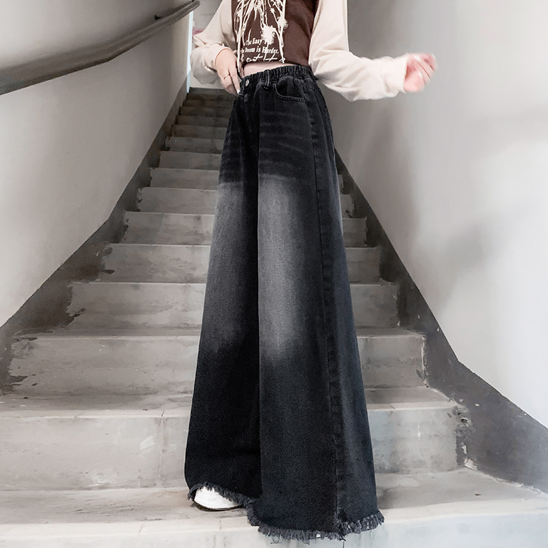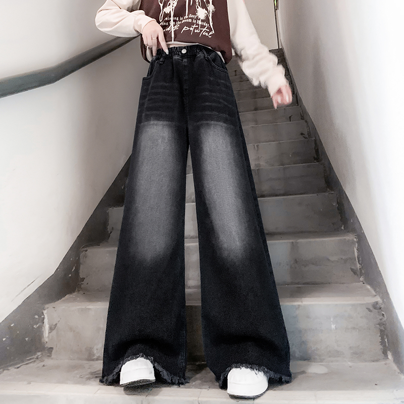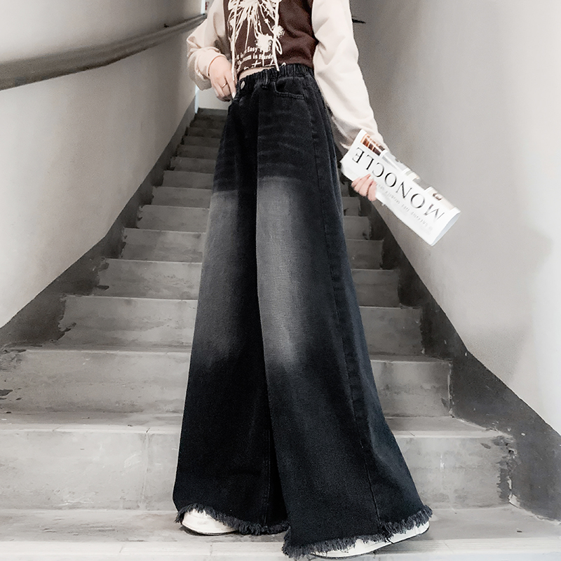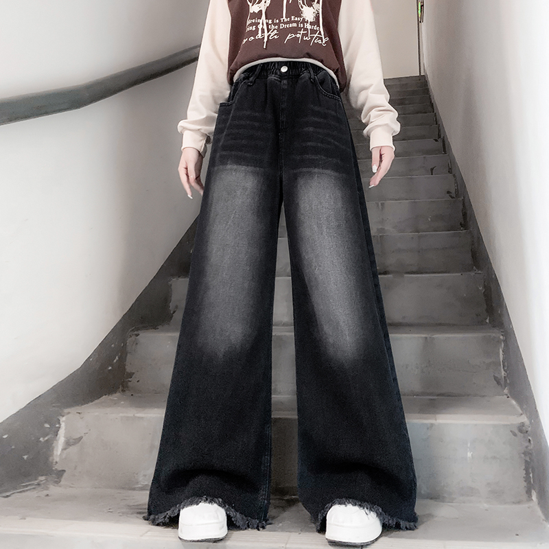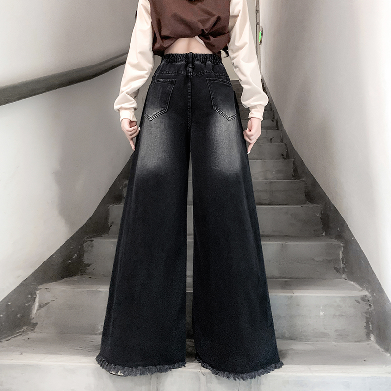 FA48202# 黑色毛边牛仔长裤宽松紧高腰直筒阔腿拖地显瘦大码女装230斤 服裝批發女裝批發服飾貨源