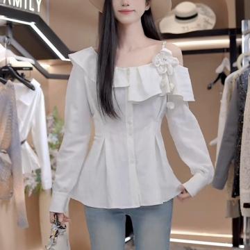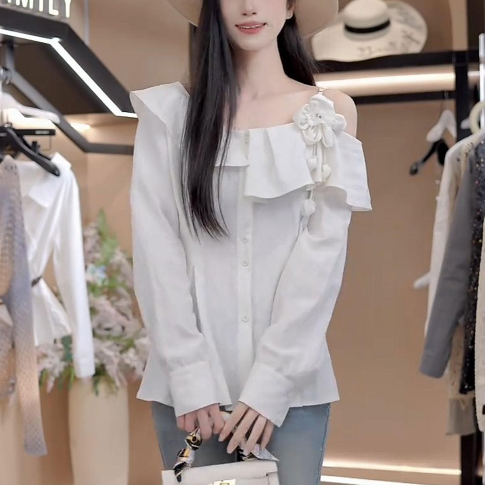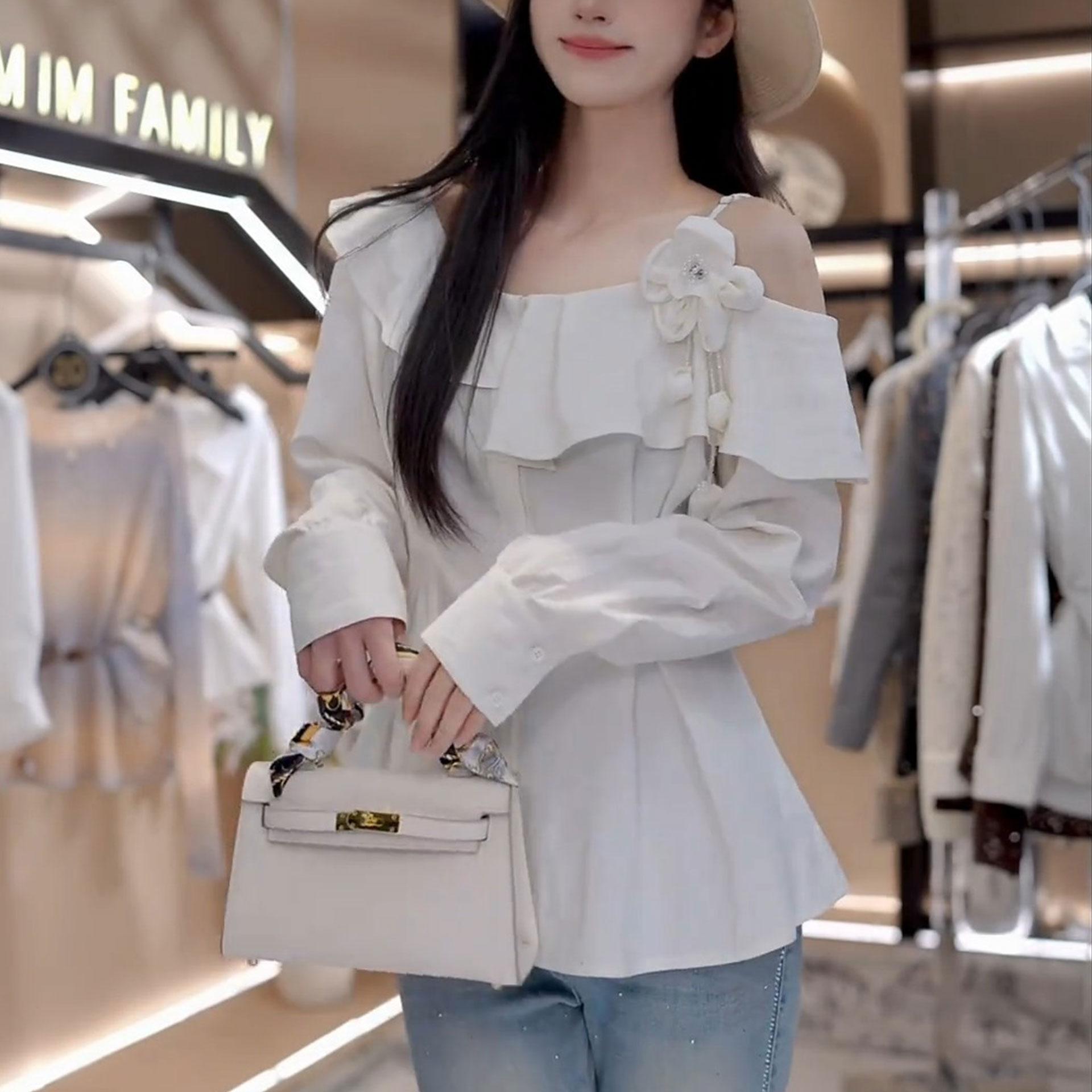 FA48210# 秋季新款洋气设计感立体花朵上衣拼接露肩百搭纯色衬衫女