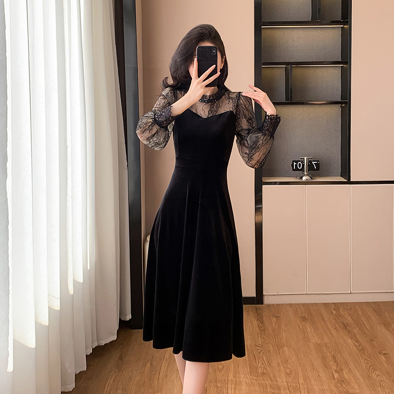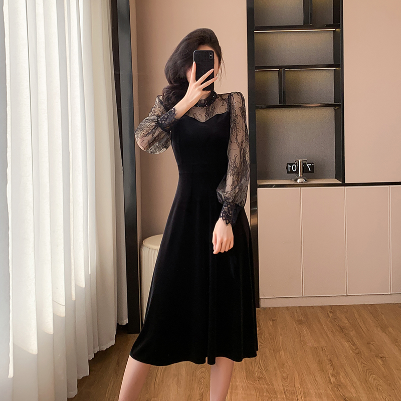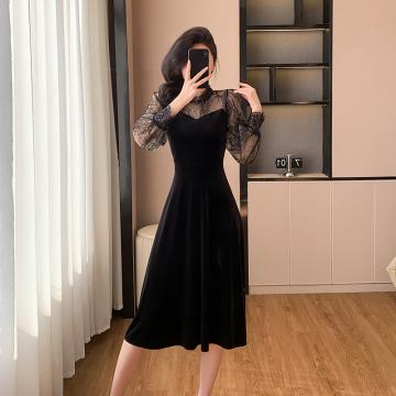 法式赫本风a字裙名媛气质拼接丝绒黑色连衣裙 服裝批發女裝批發服飾貨源